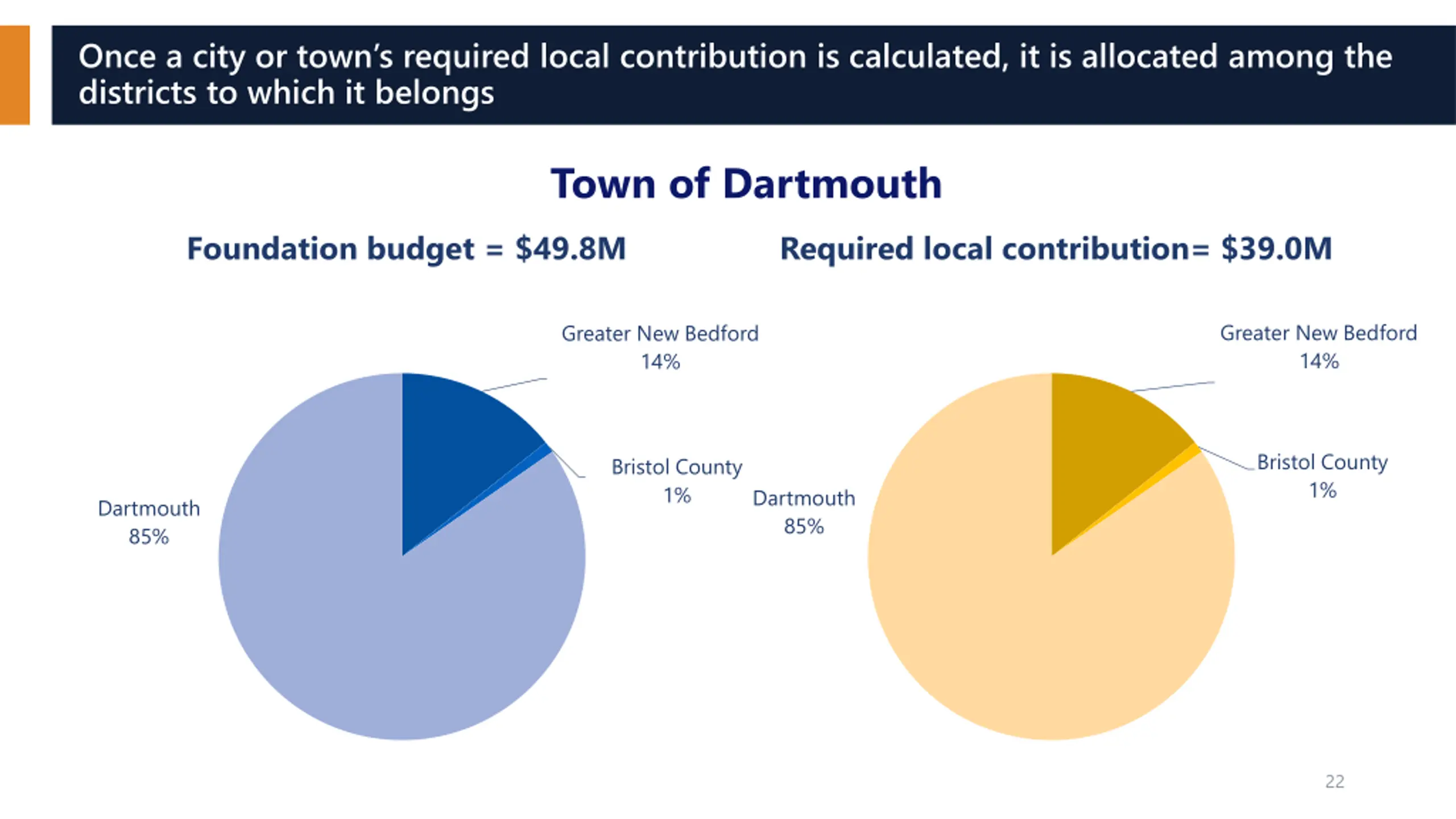 Once a city or towns required local contribution is calculated, it is allocated among the districts to which it belongs Town of Dartmouth Foundation budget = $49.8M Required local contribution= $39.0M Greater New Bedford 14% Greater New Bedford 14% Bristol County 1% Bristol County 1% Dartmouth 85% Dartmouth 85% 22
