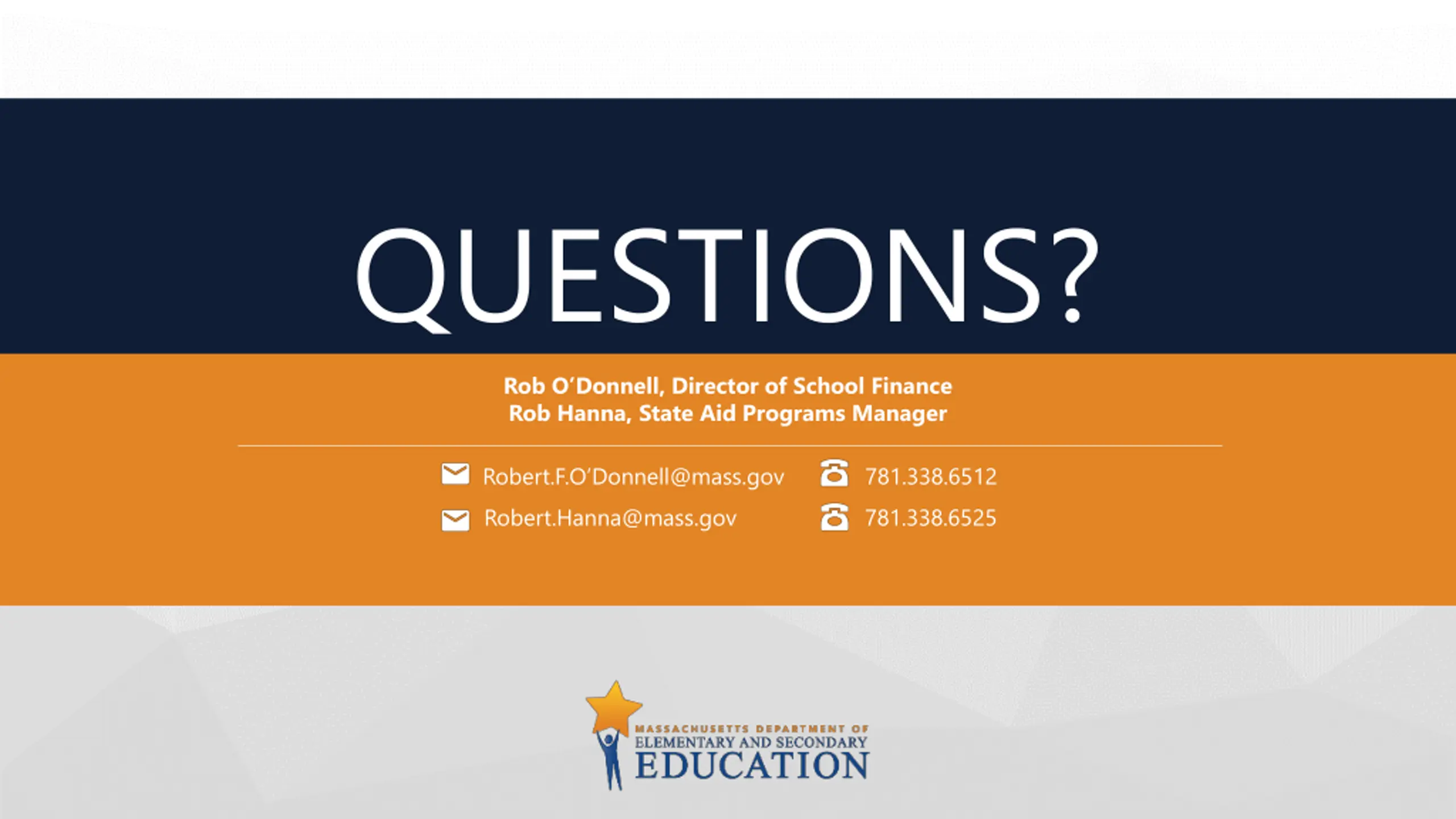 Questions? QUESTIONS? Rob O Donnell, Director of School Finance Rob Hanna, State Aid Programs Manager Robert.F.O Donnell@mass.gov Robert.Hanna@mass.gov 781.338.6512 781.338.6525