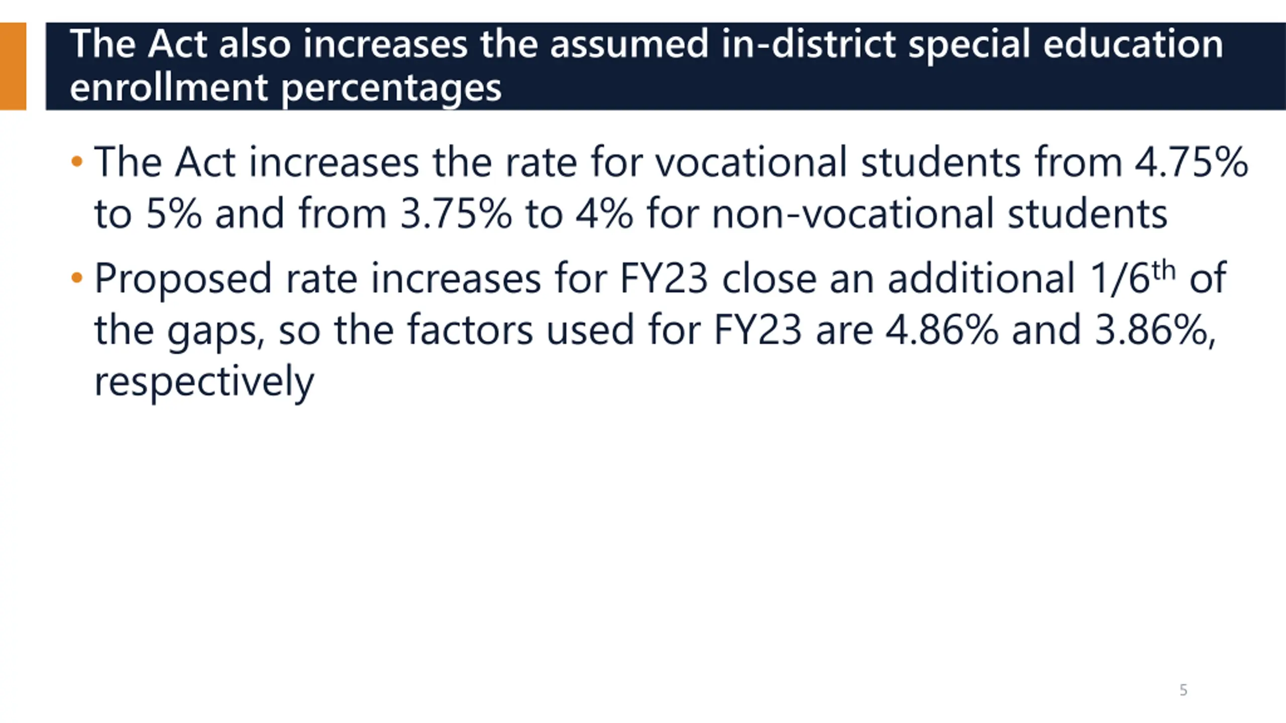 The Act also increases the assumed in-district special education enrollment percentages The Act increases the rate for vocational students from 4.75% to 5% and from 3.75% to 4% for non-vocational students Proposed rate increases for FY23 close an additional 1/6thof the gaps, so the factors used for FY23 are 4.86% and 3.86%, respectively 5
