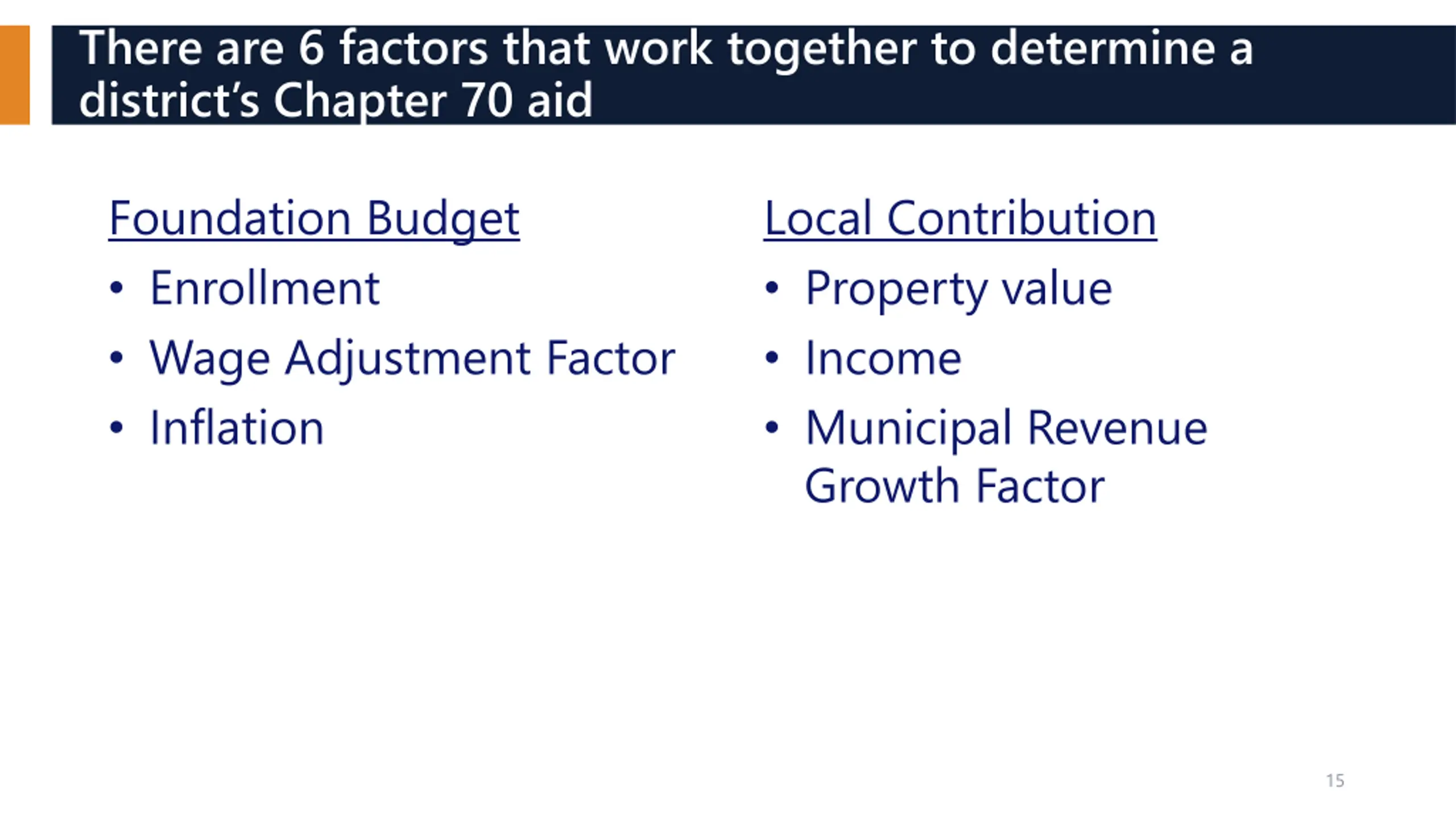 There are 6 factors that work together to determine a district s Chapter 70 aid Foundation Budget Enrollment Wage Adjustment Factor Inflation Local Contribution Property value Income Municipal Revenue Growth Factor 15
