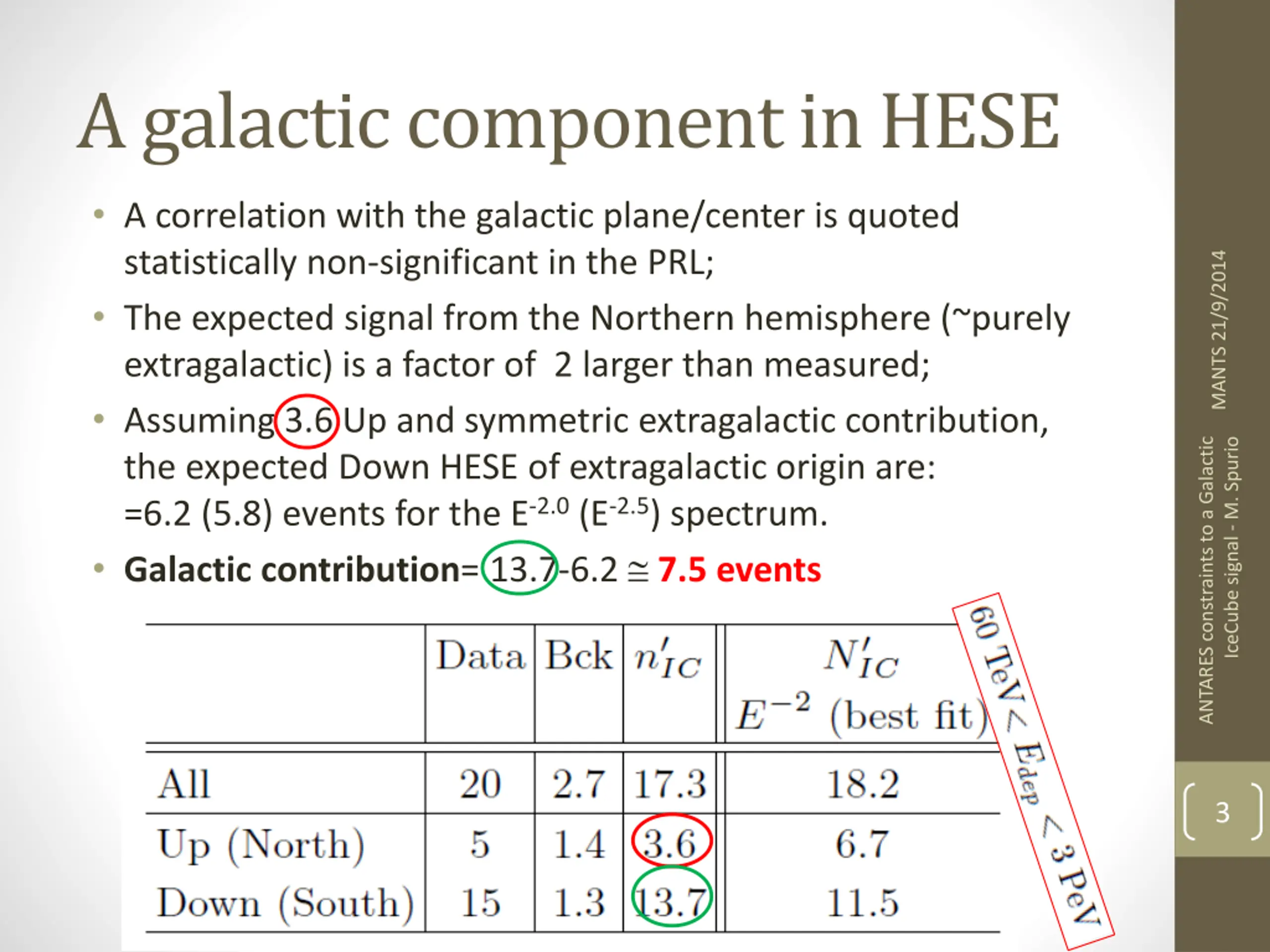 A galactic component in HESE A correlation with the galactic plane/center is quoted statistically non-significant in the PRL; The expected signal from the Northern hemisphere (~purely extragalactic) is a factor of 2 larger than measured; Assuming 3.6 Up and symmetric extragalactic contribution, the expected Down HESE of extragalactic origin are: =6.2 (5.8) events for the E-2.0 (E-2.5) spectrum. Galactic contribution= 13.7-6.2 7.5 events MANTS 21/9/2014 ANTARES constraints to a Galactic IceCube signal - M. Spurio 3