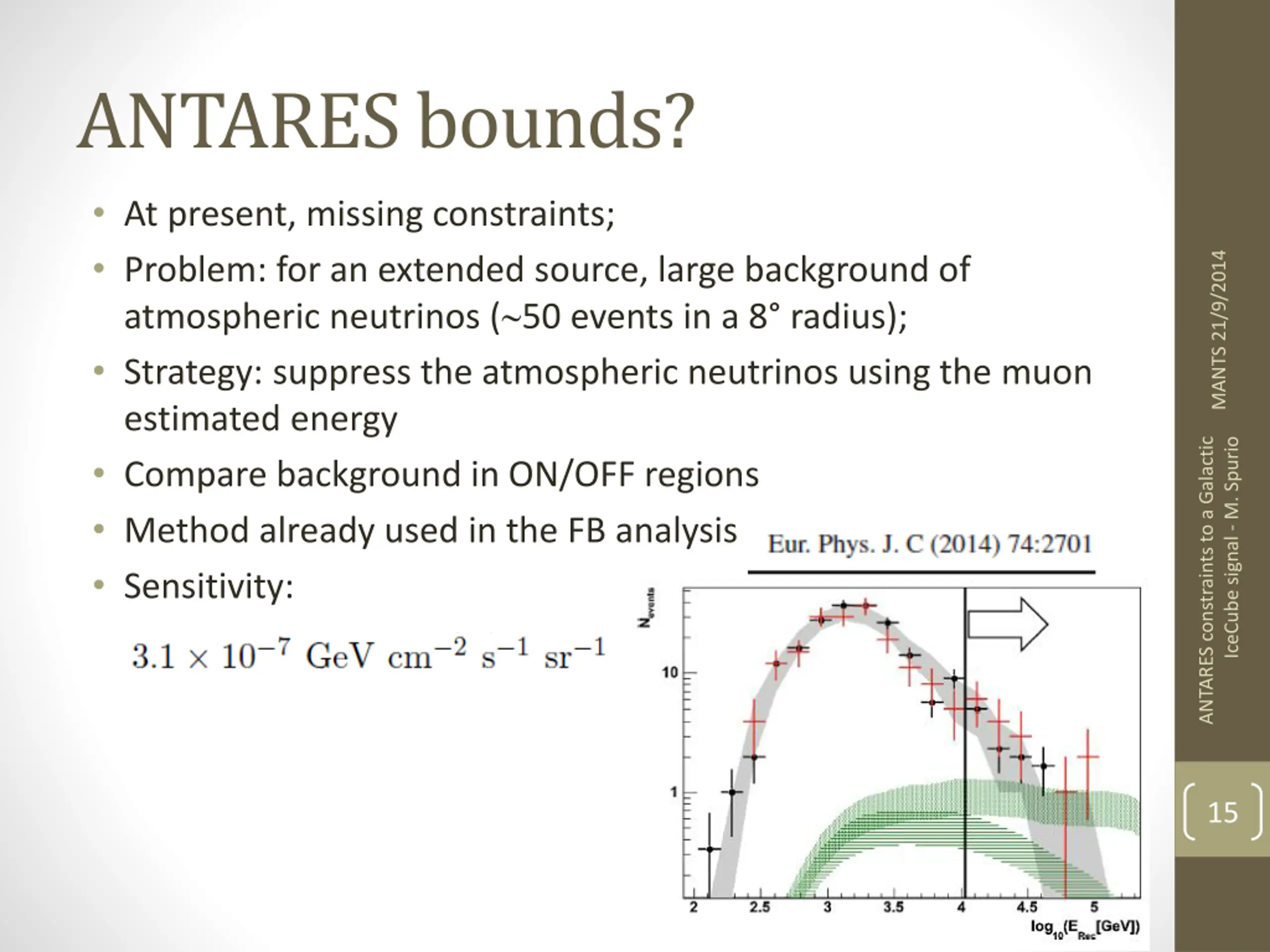 ANTARES bounds? At present, missing constraints; Problem: for an extended source, large background of atmospheric neutrinos ( 50 events in a 8 radius); Strategy: suppress the atmospheric neutrinos using the muon estimated energy Compare background in ON/OFF regions Method already used in the FB analysis Sensitivity: MANTS 21/9/2014 ANTARES constraints to a Galactic IceCube signal - M. Spurio 15