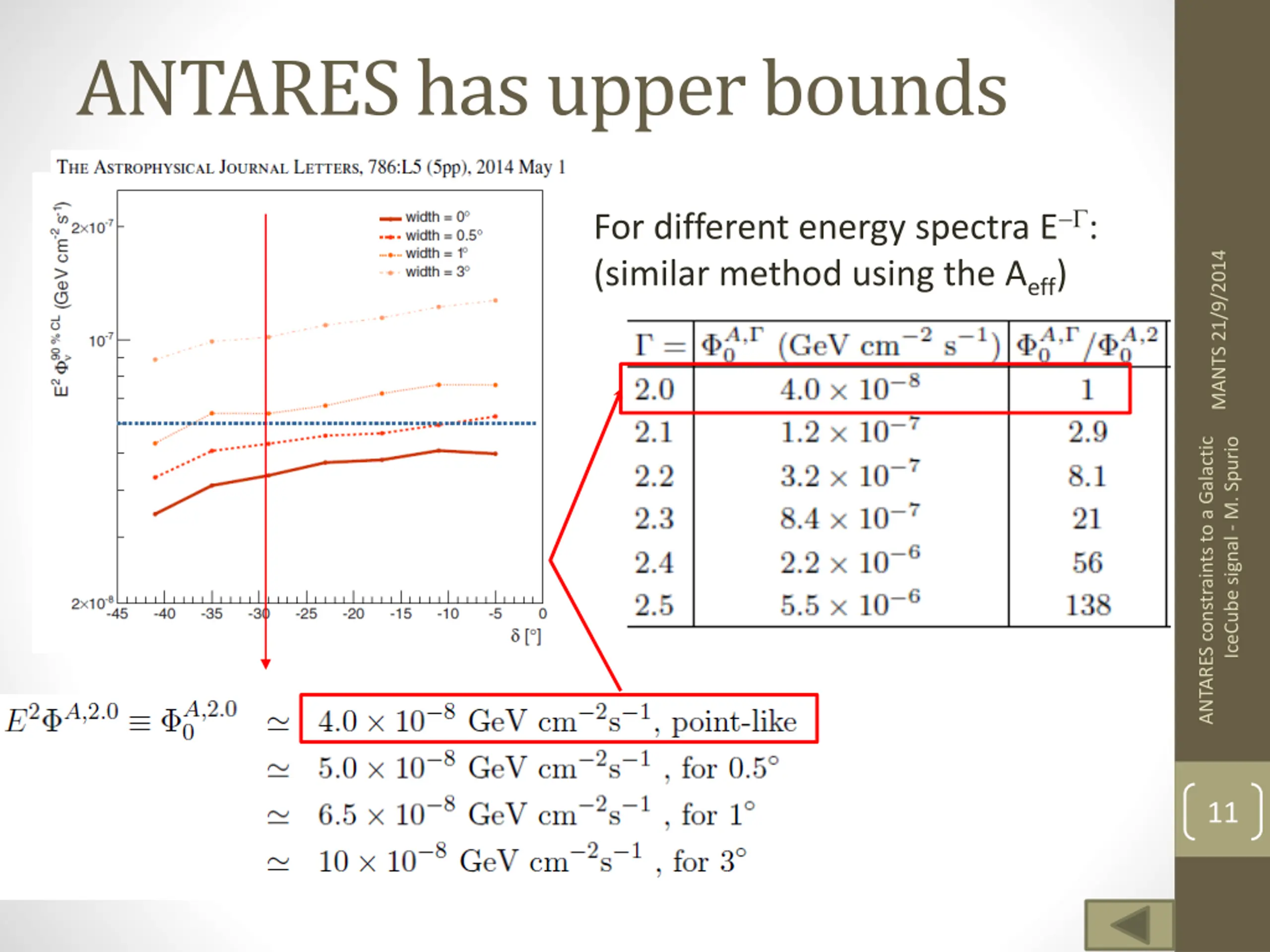 ANTARES hasupperbounds For different energy spectra E : (similar method using the Aeff) MANTS 21/9/2014 ANTARES constraints to a Galactic IceCube signal - M. Spurio 11