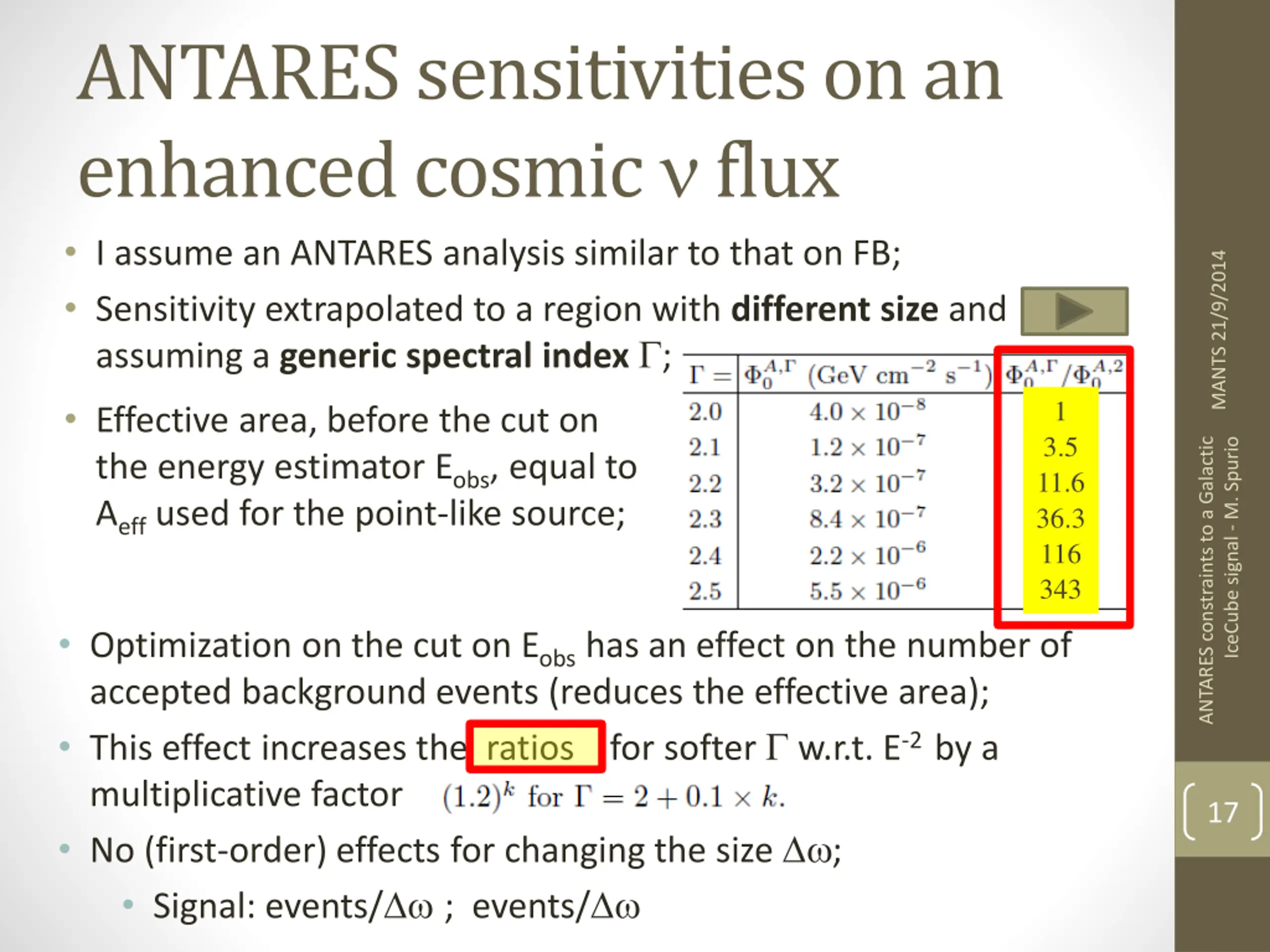ANTARES sensitivities on an enhanced cosmic flux I assume an ANTARES analysis similar to that on FB; Sensitivity extrapolated to a region with different size and assuming a generic spectral index ; MANTS 21/9/2014 1 Effective area, before the cut on the energy estimator Eobs, equal to Aeffused for the point-like source; 3.5 11.6 36.3 116 343 ANTARES constraints to a Galactic IceCube signal - M. Spurio Optimization on the cut on Eobshas an effect on the number of accepted background events (reduces the effective area); This effect increases the ratios multiplicative factor No (first-order) effects for changing the size ; Signal: events/ ; events/ for softer w.r.t. E-2 by a 17