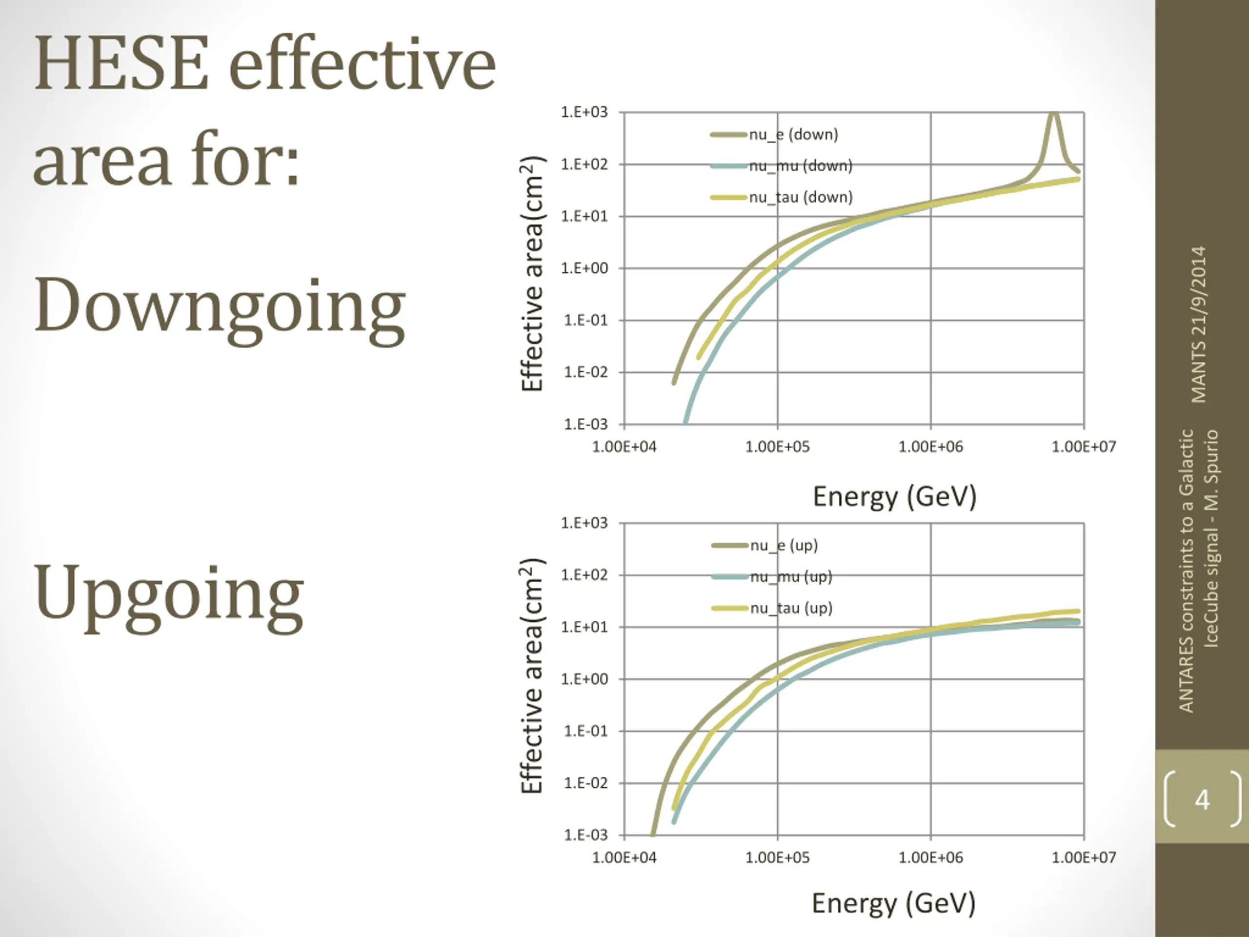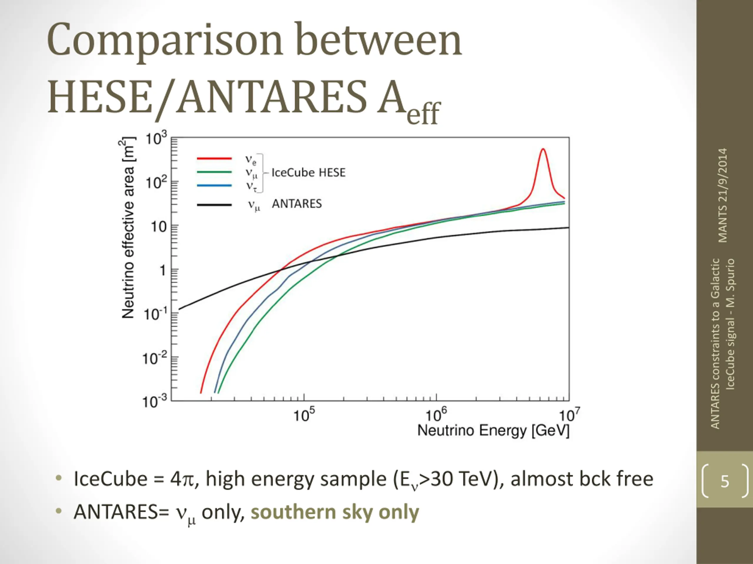 Comparisonbetween HESE/ANTARES Aeff MANTS 21/9/2014 ANTARES constraints to a Galactic IceCube signal - M. Spurio IceCube = 4 , high energy sample (E >30 TeV), almost bck free ANTARES= only, southern sky only 5