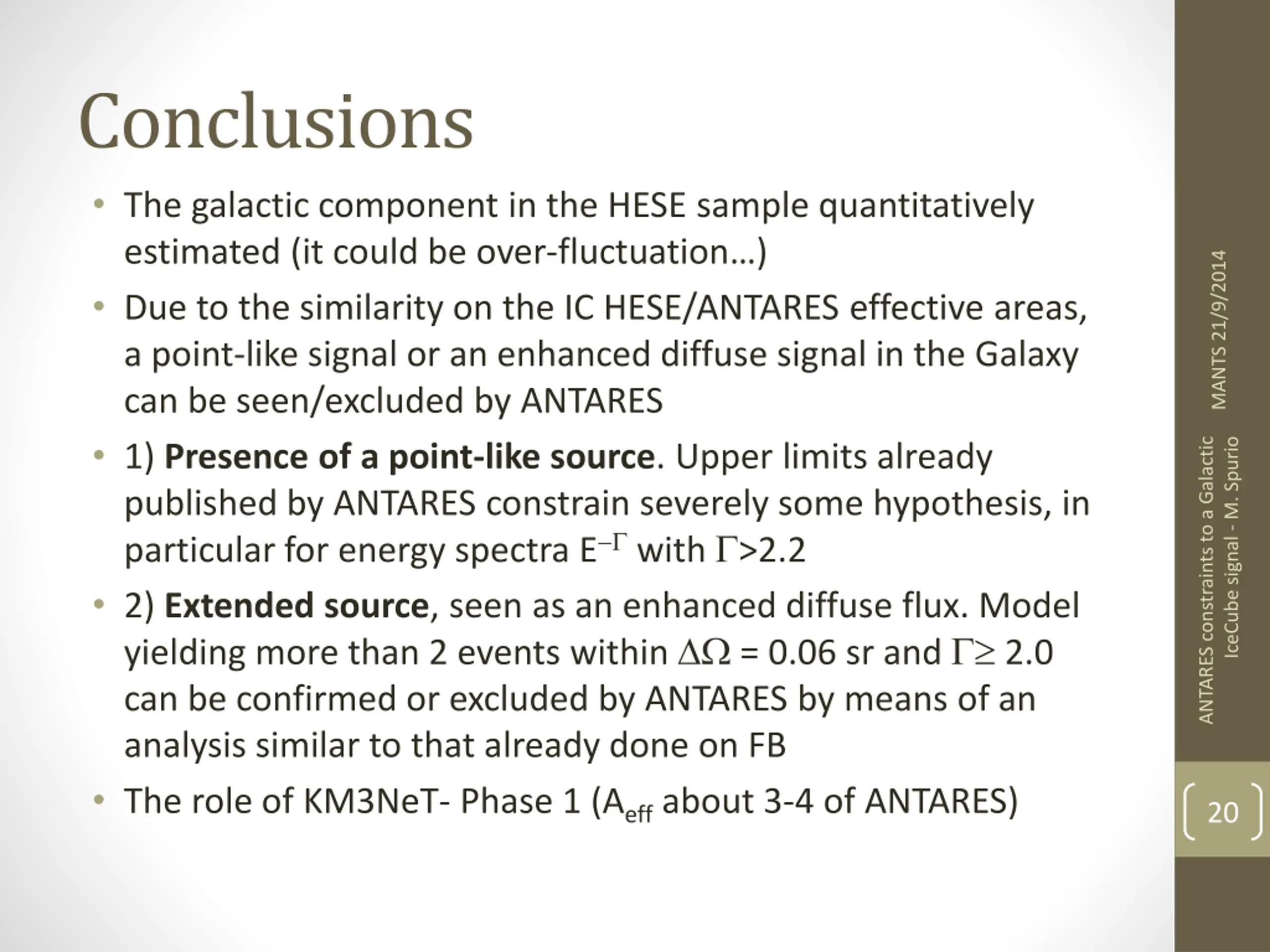 Conclusions The galactic component in the HESE sample quantitatively estimated (it could be over-fluctuation ) Due to the similarity on the IC HESE/ANTARES effective areas, a point-like signal or an enhanced diffuse signal in the Galaxy can be seen/excluded by ANTARES 1) Presence of a point-like source. Upper limits already published by ANTARES constrain severely some hypothesis, in particular for energy spectra E with >2.2 2) Extended source, seen as an enhanced diffuse flux. Model yielding more than 2 events within = 0.06 sr and 2.0 can be confirmed or excluded by ANTARES by means of an analysis similar to that already done on FB The role of KM3NeT- Phase 1 (Aeffabout 3-4 of ANTARES) MANTS 21/9/2014 ANTARES constraints to a Galactic IceCube signal - M. Spurio 20