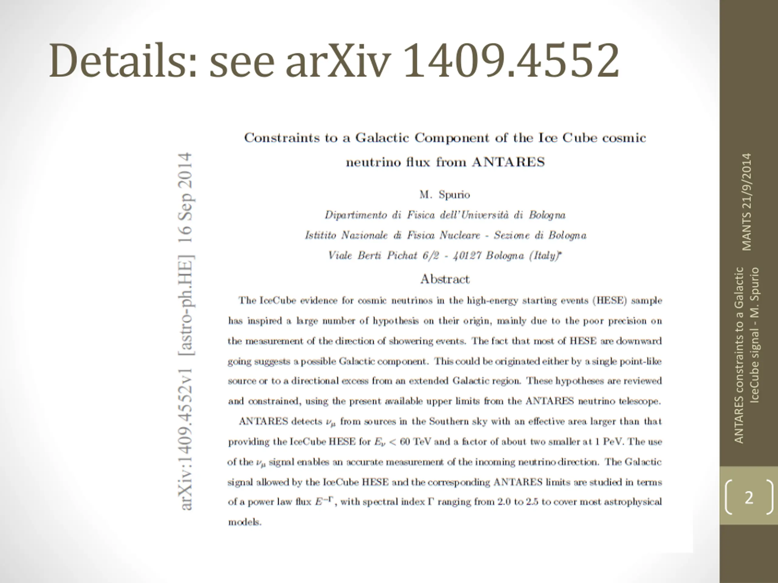 Details: seearXiv1409.4552 MANTS 21/9/2014 ANTARES constraints to a Galactic IceCube signal - M. Spurio 2