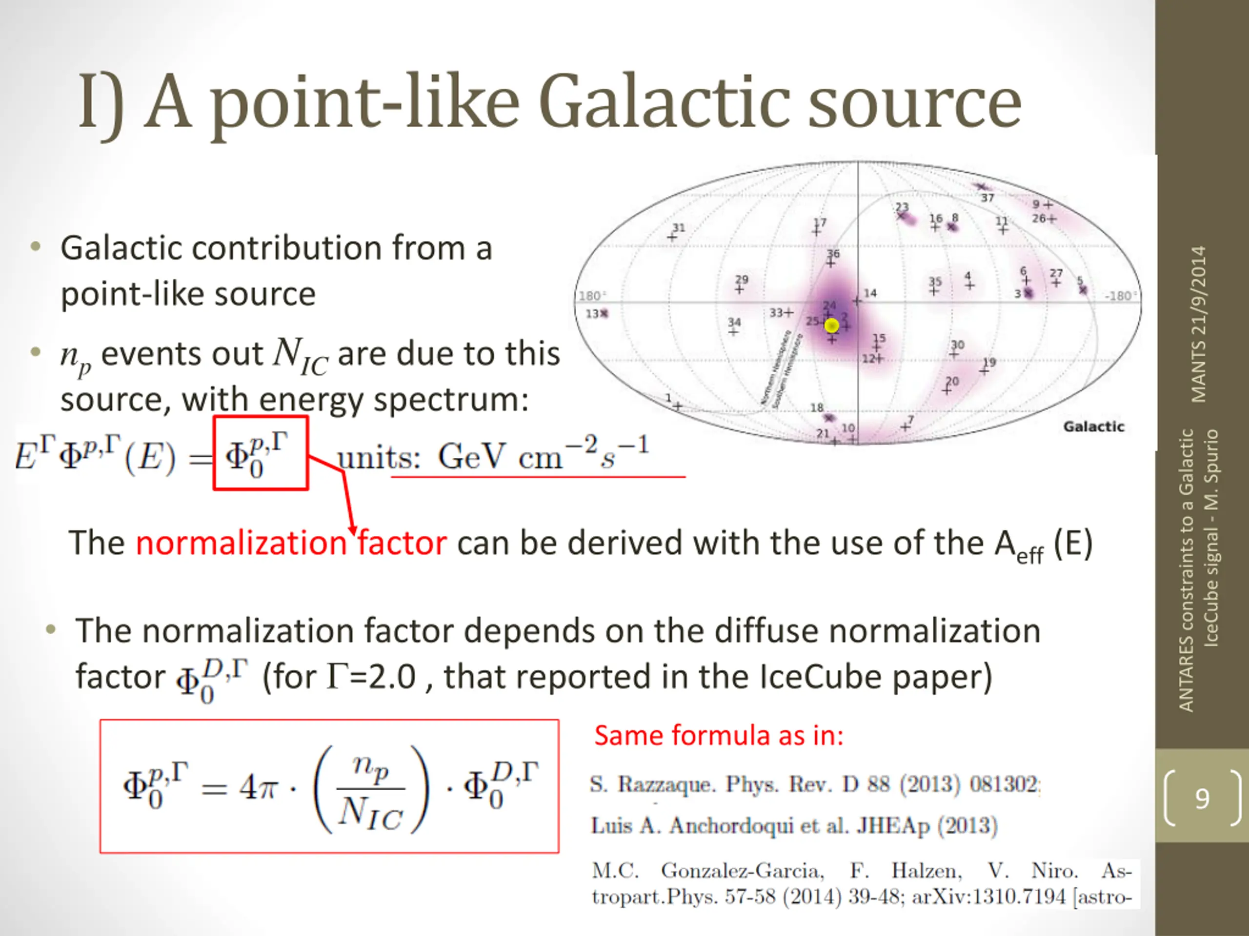 I) A point-likeGalacticsource Galactic contribution from a point-like source np events out NIC are due to this source, with energy spectrum: MANTS 21/9/2014 ANTARES constraints to a Galactic IceCube signal - M. Spurio The normalization factor can be derived with the use of the Aeff (E) The normalization factor depends on the diffuse normalization factor (for =2.0 , that reported in the IceCube paper) Same formula as in: 9
