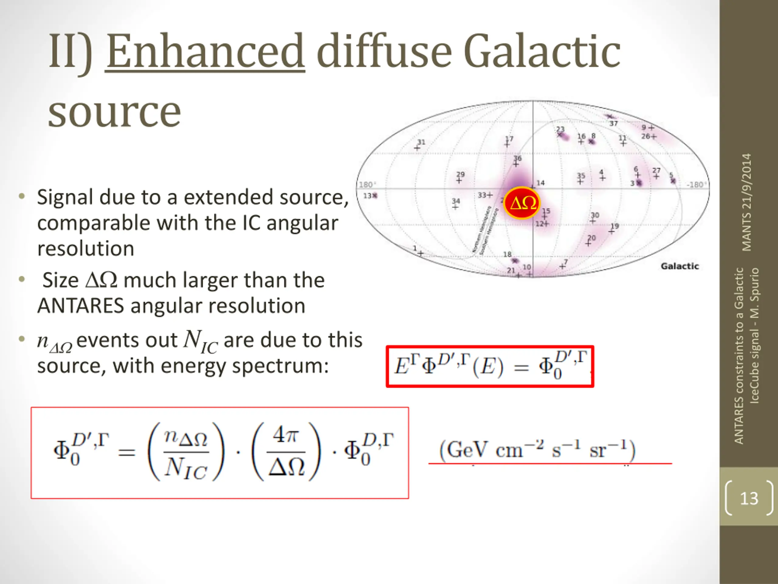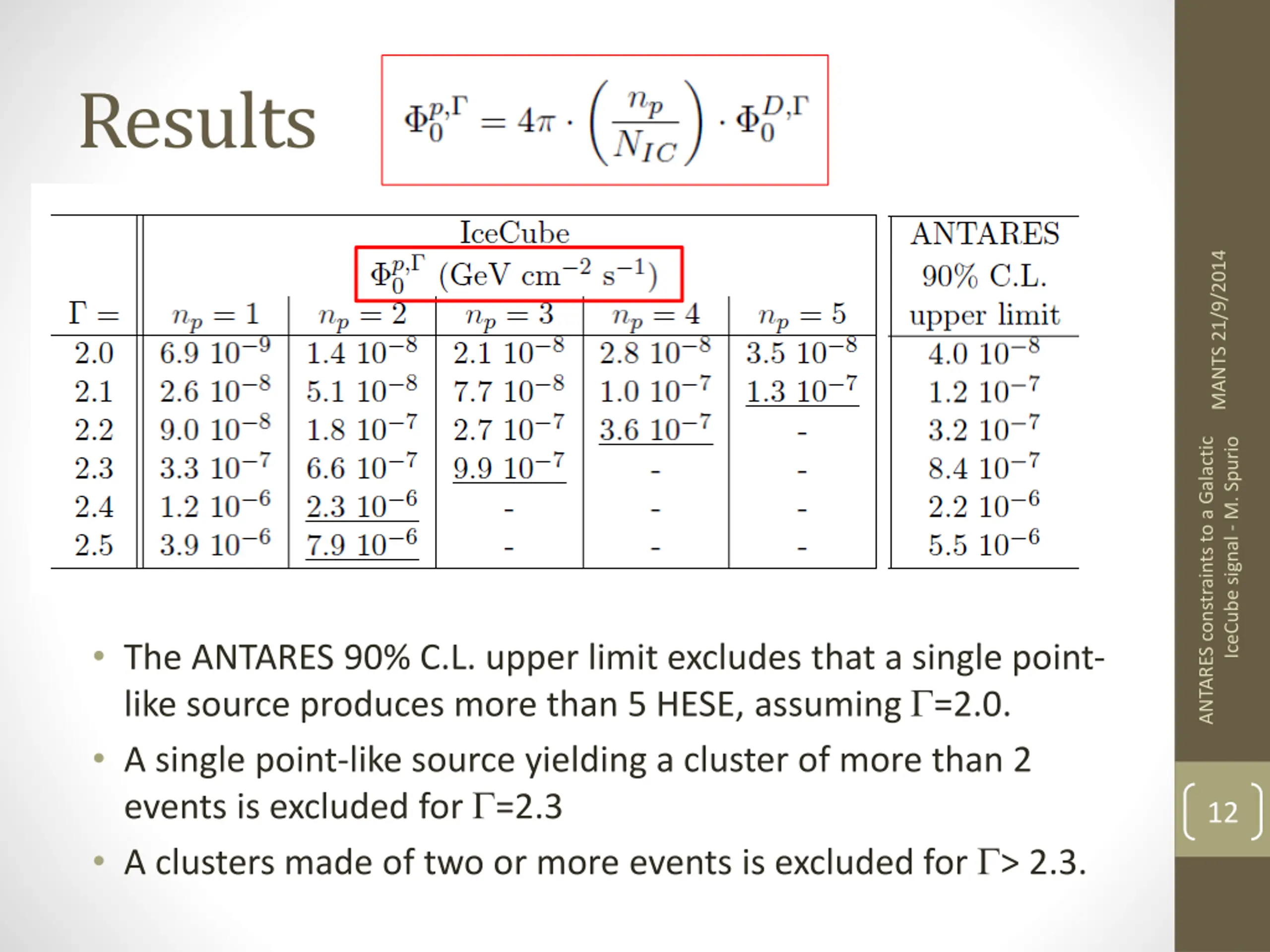 Results MANTS 21/9/2014 ANTARES constraints to a Galactic IceCube signal - M. Spurio The ANTARES 90% C.L. upper limit excludes that a single point- like source produces more than 5 HESE, assuming =2.0. A single point-like source yielding a cluster of more than 2 events is excluded for =2.3 A clusters made of two or more events is excluded for > 2.3. 12