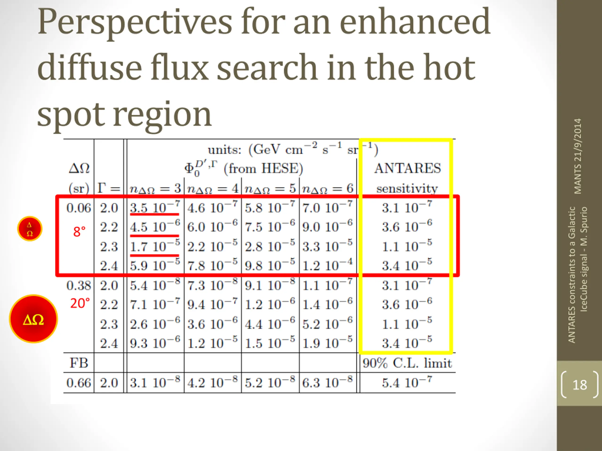 Perspectives for an enhanced diffuse flux search in the hot spot region MANTS 21/9/2014 ANTARES constraints to a Galactic IceCube signal - M. Spurio 8 20 18