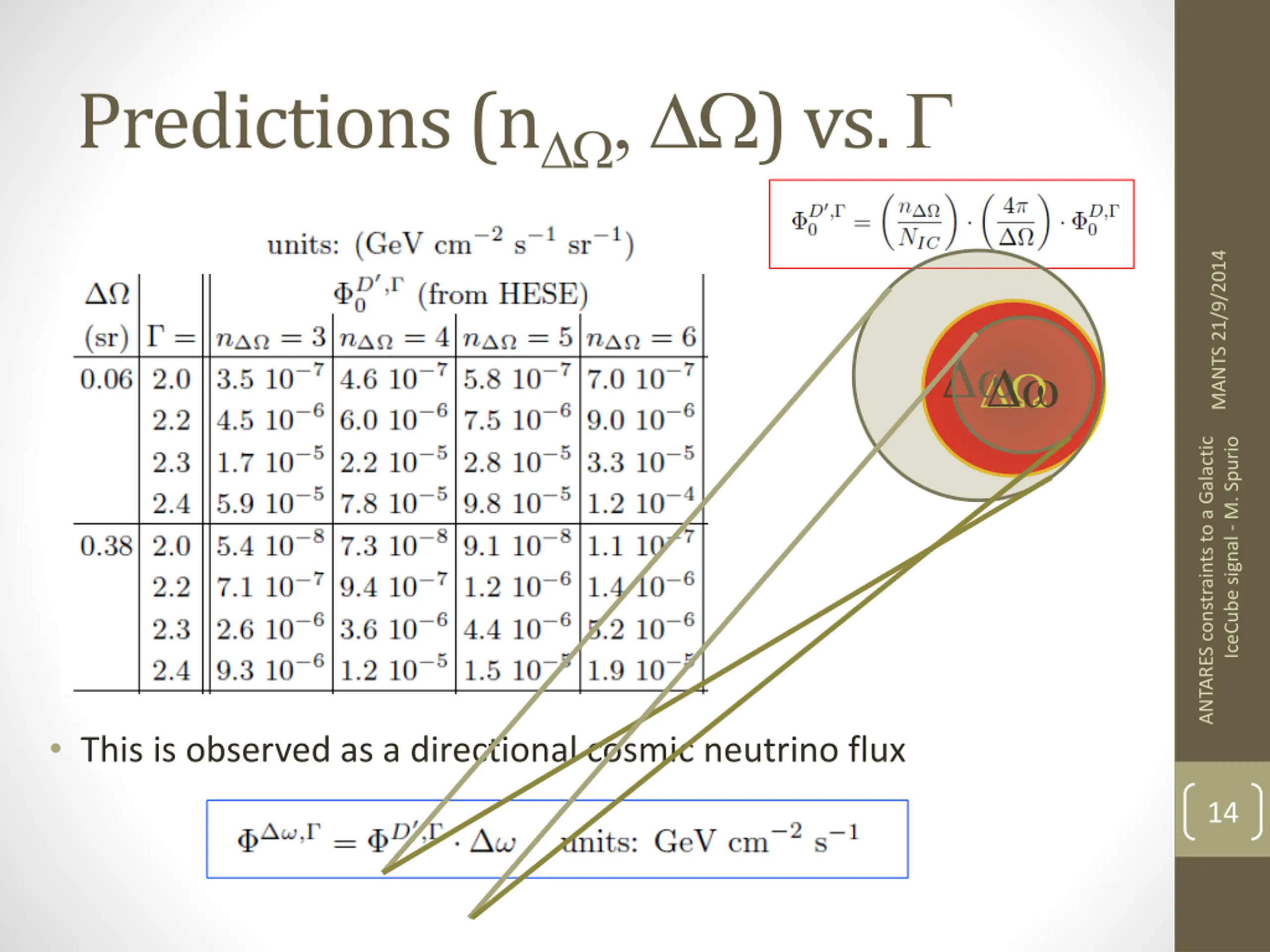 Predictions(n ) vs. MANTS 21/9/2014 ANTARES constraints to a Galactic IceCube signal - M. Spurio This is observed as a directional cosmic neutrino flux 14