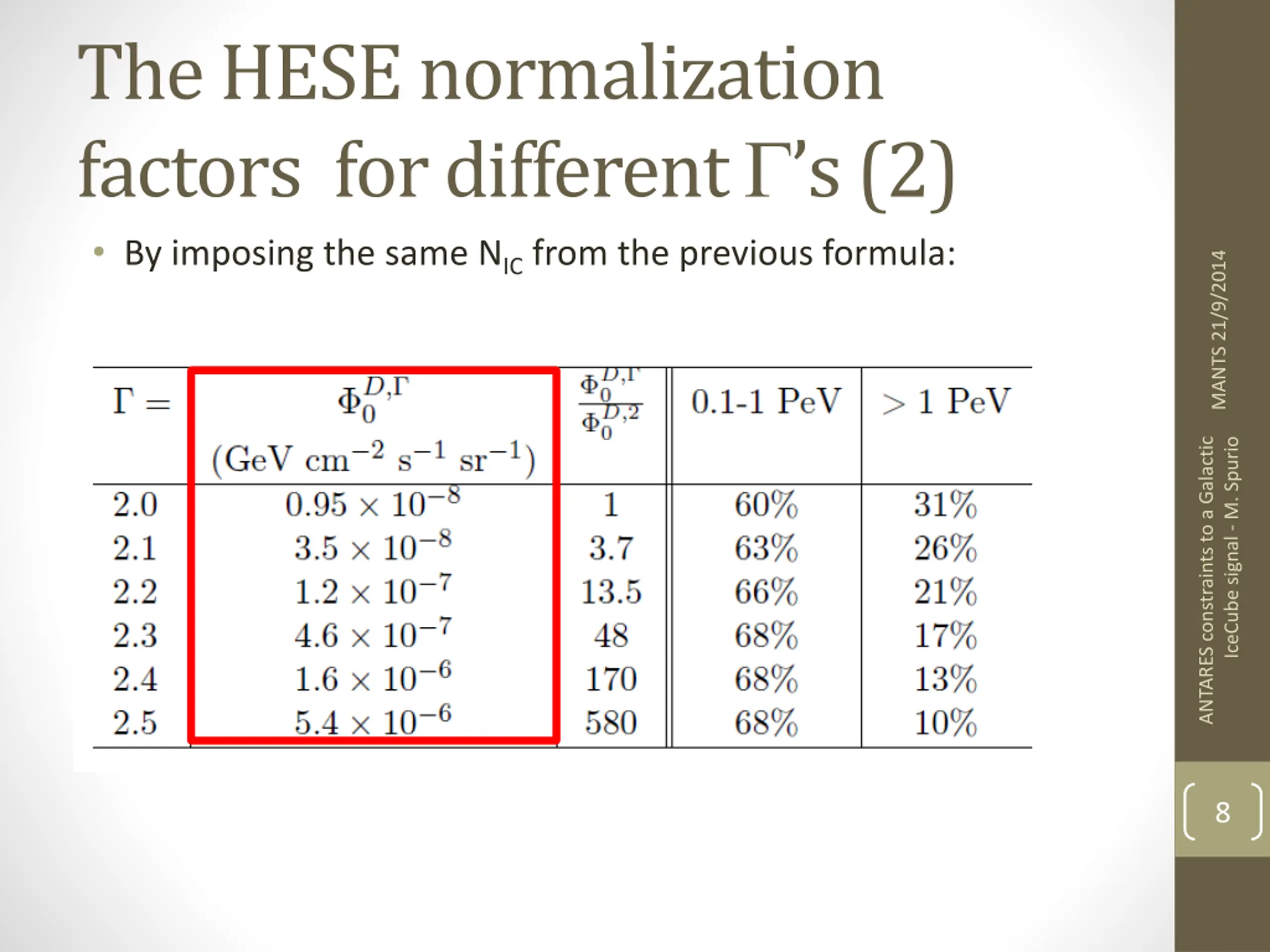 The HESE normalization factors for different s(2) By imposing the same NICfrom the previous formula: MANTS 21/9/2014 ANTARES constraints to a Galactic IceCube signal - M. Spurio 8
