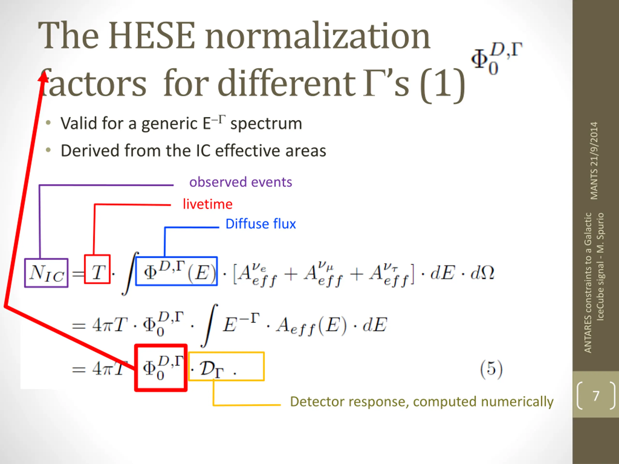 The HESE normalization factors for different s(1) Valid for a generic E spectrum Derived from the IC effective areas MANTS 21/9/2014 observed events livetime ANTARES constraints to a Galactic IceCube signal - M. Spurio Diffuse flux 7 Detector response, computed numerically