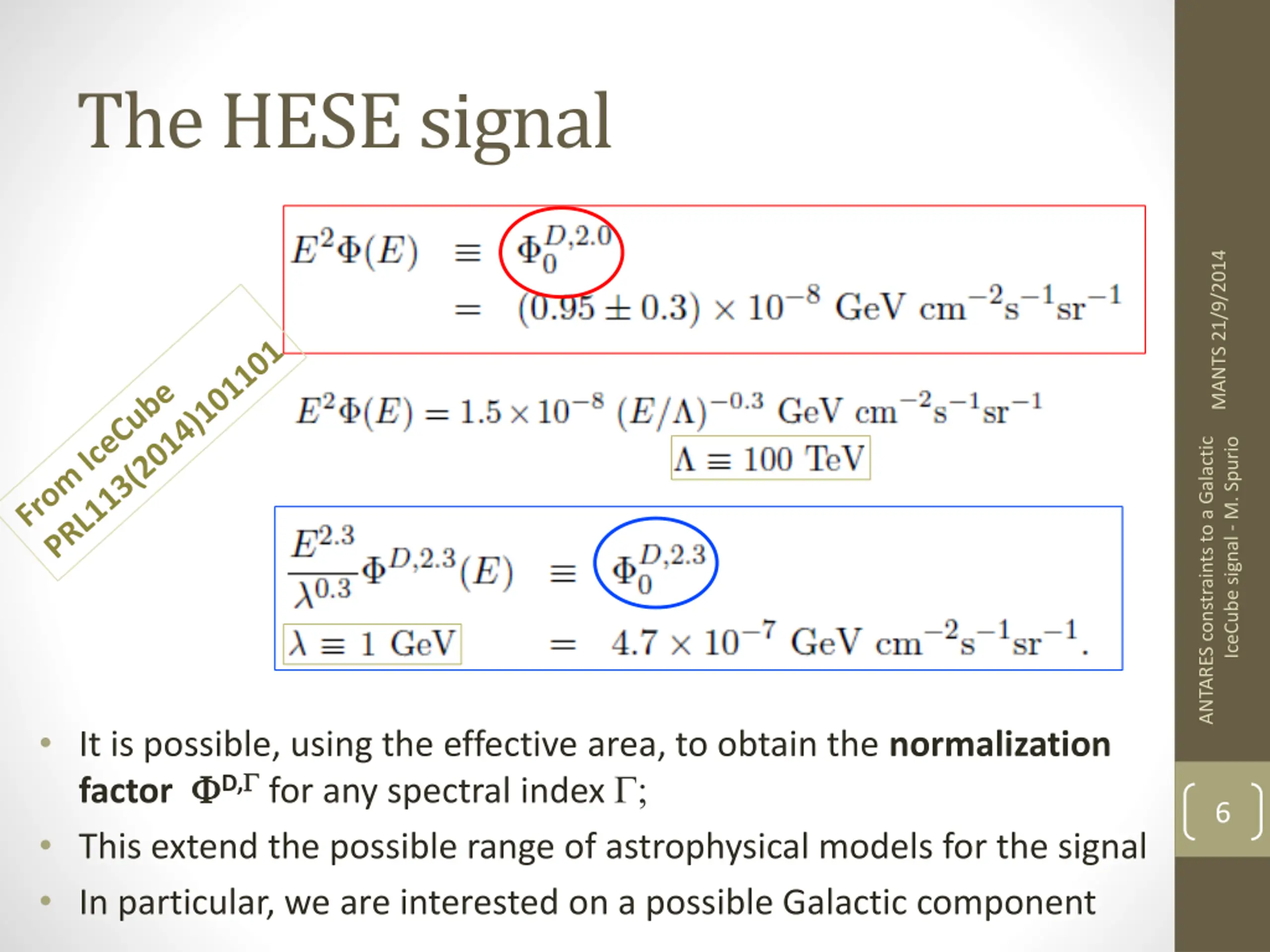 The HESE signal MANTS 21/9/2014 ANTARES constraints to a Galactic IceCube signal - M. Spurio It is possible, using the effective area, to obtain the normalization factor D, for any spectral index This extend the possible range of astrophysical models for the signal In particular, we are interested on a possible Galactic component 6