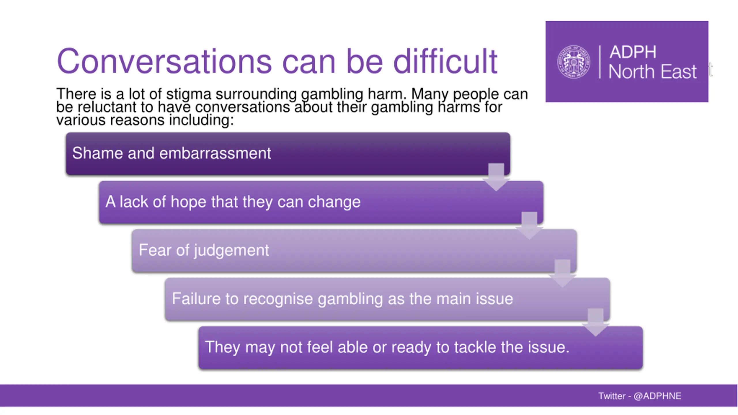 Conversations can be difficult There is a lot of stigma surrounding gambling harm. Many people can be reluctant to have conversations about their gambling harms for various reasons including: Shame and embarrassment A lack of hope that they can change Fear of judgement Failure to recognise gambling as the main issue They may not feel able or ready to tackle the issue. Twitter - @ADPHNE