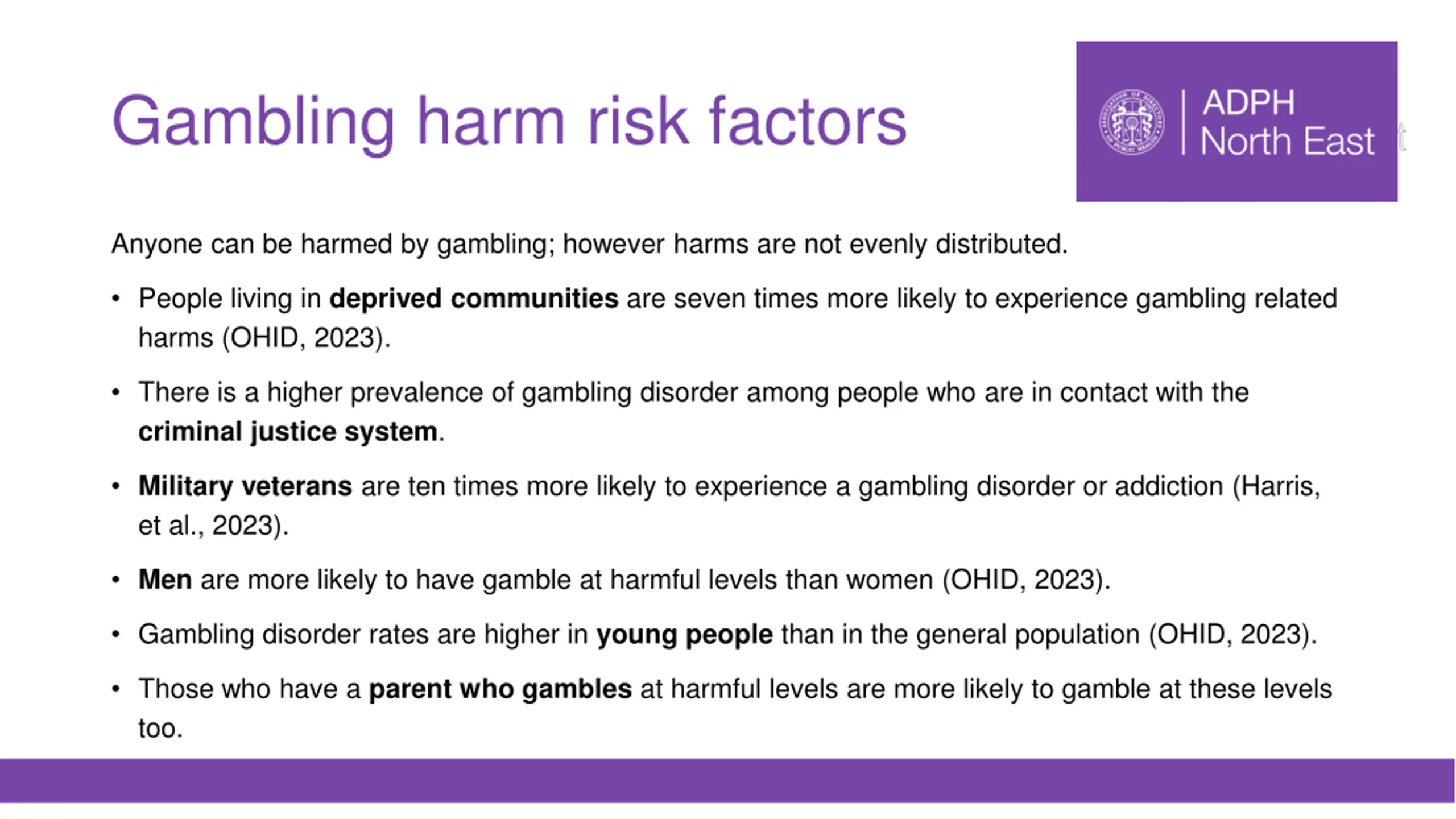 Gambling harm risk factors Anyone can be harmed by gambling; however harms are not evenly distributed. People living in deprived communities are seven times more likely to experience gambling related harms (OHID, 2023). There is a higher prevalence of gambling disorder among people who are in contact with the criminal justice system. Military veterans are ten times more likely to experience a gambling disorder or addiction (Harris, et al., 2023). Men are more likely to have gamble at harmful levels than women (OHID, 2023). Gambling disorder rates are higher in young people than in the general population (OHID, 2023). Those who have a parent who gambles at harmful levels are more likely to gamble at these levels too.