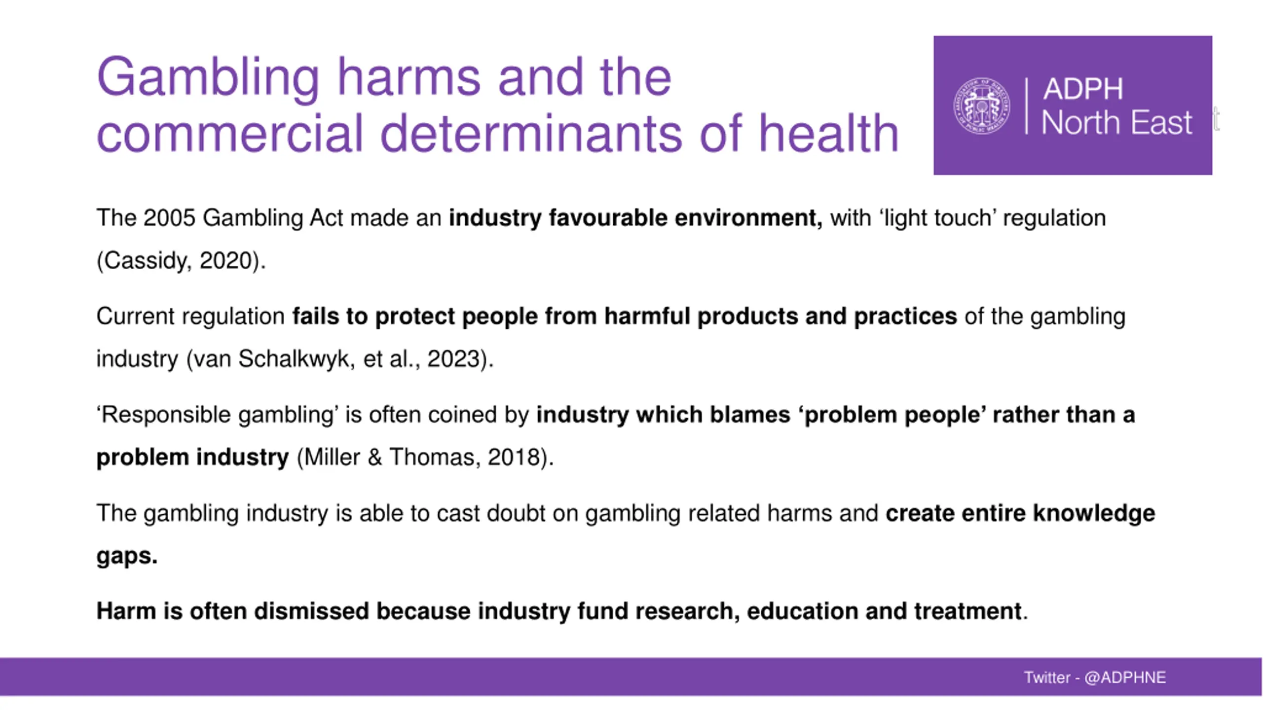 Gambling harms and the commercial determinants of health The 2005 Gambling Act made an industry favourable environment, with light touch regulation (Cassidy, 2020). Current regulation fails to protect people from harmful products and practices of the gambling industry (van Schalkwyk, et al., 2023). Responsible gambling is often coined by industry which blames problem people rather than a problem industry (Miller & Thomas, 2018). The gambling industry is able to cast doubt on gambling related harms and create entire knowledge gaps. Harm is often dismissed because industry fund research, education and treatment. Twitter - @ADPHNE