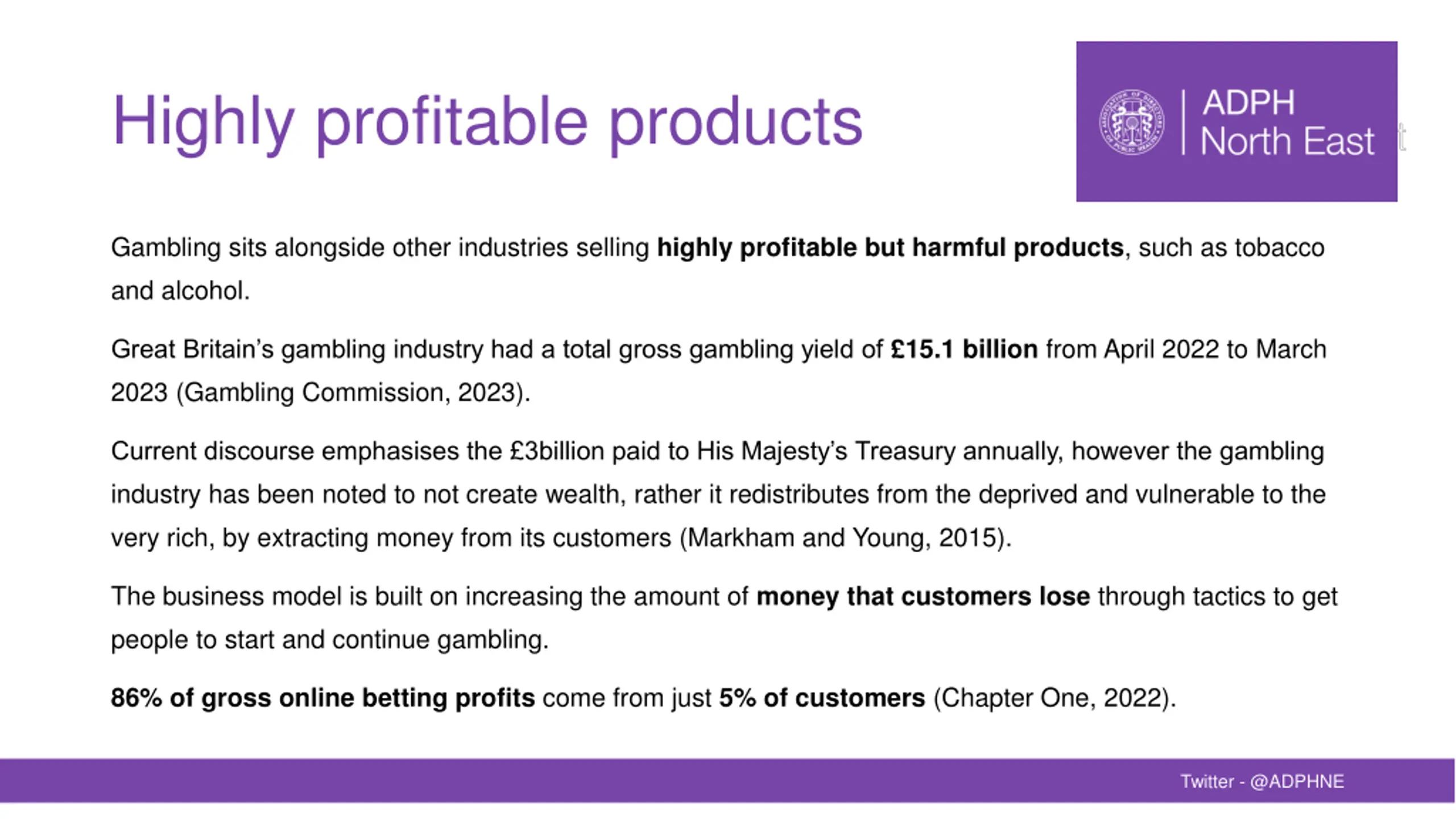 Highly profitable products Gambling sits alongside other industries selling highly profitable but harmful products, such as tobacco and alcohol. Great Britain s gambling industry had a total gross gambling yield of 15.1 billion from April 2022 to March 2023 (Gambling Commission, 2023). Current discourse emphasises the 3billion paid to His Majesty s Treasury annually, however the gambling industry has been noted to not create wealth, rather it redistributes from the deprived and vulnerable to the very rich, by extracting money from its customers (Markham and Young, 2015). The business model is built on increasing the amount of money that customers lose through tactics to get people to start and continue gambling. 86% of gross online betting profits come from just 5% of customers (Chapter One, 2022). Twitter - @ADPHNE