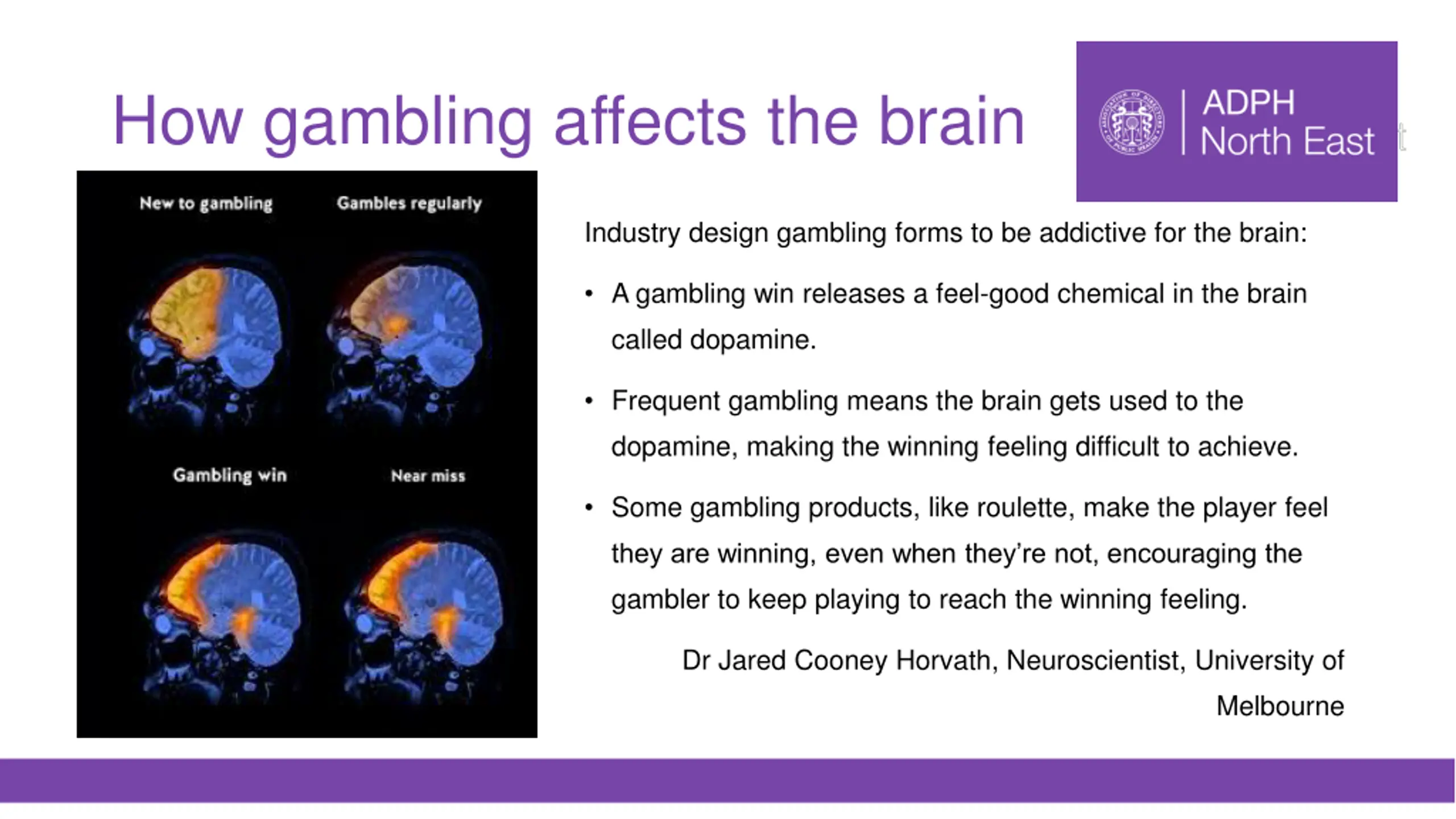 How gambling affects the brain Industry design gambling forms to be addictive for the brain: A gambling win releases a feel-good chemical in the brain called dopamine. Frequent gambling means the brain gets used to the dopamine, making the winning feeling difficult to achieve. Some gambling products, like roulette, make the player feel they are winning, even when they re not, encouraging the gambler to keep playing to reach the winning feeling. Dr Jared Cooney Horvath, Neuroscientist, University of Melbourne