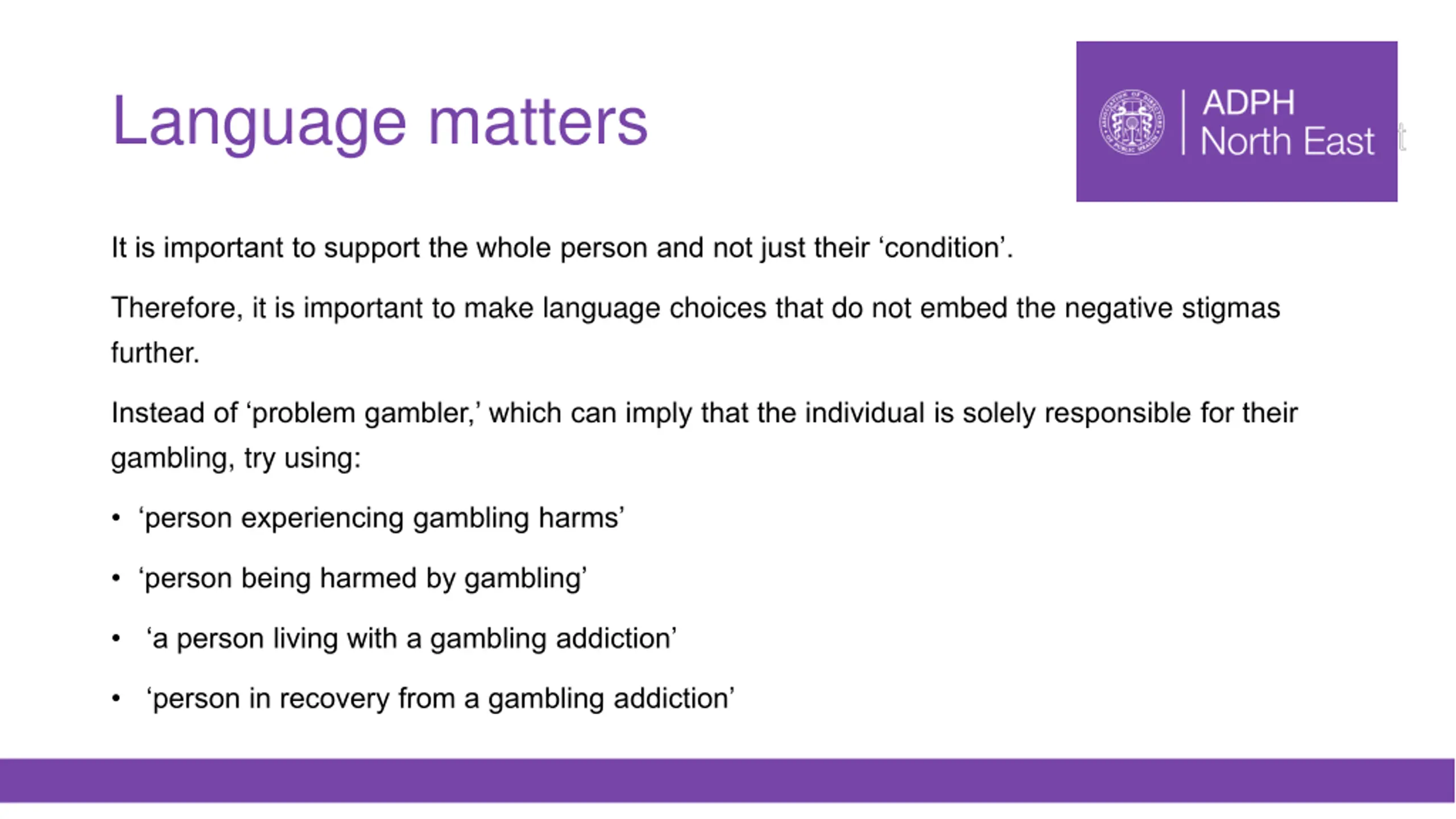 Language matters It is important to support the whole person and not just their condition . Therefore, it is important to make language choices that do not embed the negative stigmas further. Instead of problem gambler, which can imply that the individual is solely responsible for their gambling, try using: person experiencing gambling harms person being harmed by gambling a person living with a gambling addiction person in recovery from a gambling addiction