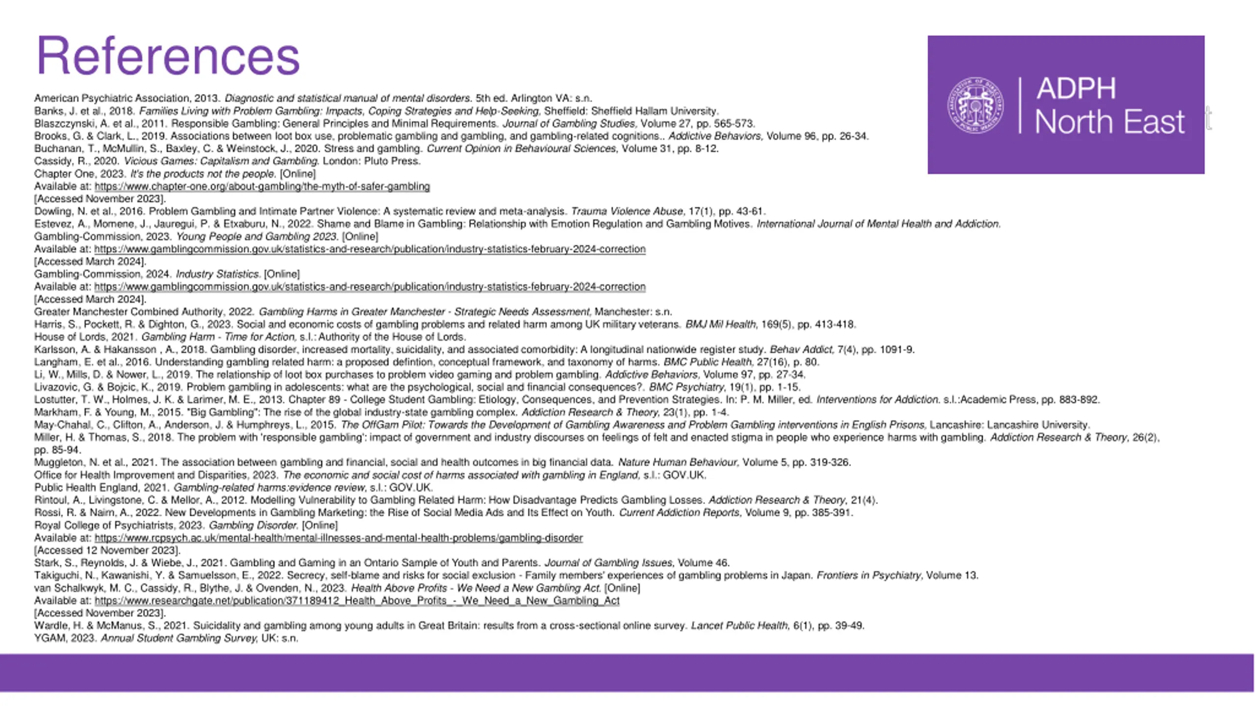 References American Psychiatric Association, 2013. Diagnostic and statistical manual of mental disorders. 5th ed. Arlington VA: s.n. Banks, J. et al., 2018. Families Living with Problem Gambling: Impacts, Coping Strategies and Help-Seeking, Sheffield: Sheffield Hallam University. Blaszczynski, A. et al., 2011. Responsible Gambling: General Principles and Minimal Requirements. Journal of Gambling Studies, Volume 27, pp. 565-573. Brooks, G. & Clark, L., 2019. Associations between loot box use, problematic gambling and gambling, and gambling-related cognitions.. Addictive Behaviors, Volume 96, pp. 26-34. Buchanan, T., McMullin, S., Baxley, C. & Weinstock, J., 2020. Stress and gambling. Current Opinion in Behavioural Sciences, Volume 31, pp. 8-12. Cassidy, R., 2020. Vicious Games: Capitalism and Gambling. London: Pluto Press. Chapter One, 2023. It's the products not the people. [Online] Available at: https://www.chapter-one.org/about-gambling/the-myth-of-safer-gambling [Accessed November 2023]. Dowling, N. et al., 2016. Problem Gambling and Intimate Partner Violence: A systematic review and meta-analysis. Trauma Violence Abuse, 17(1), pp. 43-61. Estevez, A., Momene, J., Jauregui, P. & Etxaburu, N., 2022. Shame and Blame in Gambling: Relationship with Emotion Regulation and Gambling Motives. International Journal of Mental Health and Addiction. Gambling-Commission, 2023. Young People and Gambling 2023. [Online] Available at: https://www.gamblingcommission.gov.uk/statistics-and-research/publication/industry-statistics-february-2024-correction [Accessed March 2024]. Gambling-Commission, 2024. Industry Statistics. [Online] Available at: https://www.gamblingcommission.gov.uk/statistics-and-research/publication/industry-statistics-february-2024-correction [Accessed March 2024]. Greater Manchester Combined Authority, 2022. Gambling Harms in Greater Manchester - Strategic Needs Assessment, Manchester: s.n. Harris, S., Pockett, R. & Dighton, G., 2023. Social and economic costs of gambling problems and related harm among UK military veterans. BMJ Mil Health, 169(5), pp. 413-418. House of Lords, 2021. Gambling Harm - Time for Action, s.l.: Authority of the House of Lords. Karlsson, A. & Hakansson , A., 2018. Gambling disorder, increased mortality, suicidality, and associated comorbidity: A longitudinal nationwide register study. Behav Addict, 7(4), pp. 1091-9. Langham, E. et al., 2016. Understanding gambling related harm: a proposed defintion, conceptual framework, and taxonomy of harms. BMC Public Health, 27(16), p. 80. Li, W., Mills, D. & Nower, L., 2019. The relationship of loot box purchases to problem video gaming and problem gambling. Addictive Behaviors, Volume 97, pp. 27-34. Livazovic, G. & Bojcic, K., 2019. Problem gambling in adolescents: what are the psychological, social and financial consequences?. BMC Psychiatry, 19(1), pp. 1-15. Lostutter, T. W., Holmes, J. K. & Larimer, M. E., 2013. Chapter 89 - College Student Gambling: Etiology, Consequences, and Prevention Strategies. In: P. M. Miller, ed. Interventions for Addiction. s.l.:Academic Press, pp. 883-892. Markham, F. & Young, M., 2015. "Big Gambling": The rise of the global industry-state gambling complex. Addiction Research & Theory, 23(1), pp. 1-4. May-Chahal, C., Clifton, A., Anderson, J. & Humphreys, L., 2015. The OffGam Pilot: Towards the Development of Gambling Awareness and Problem Gambling interventions in English Prisons, Lancashire: Lancashire University. Miller, H. & Thomas, S., 2018. The problem with 'responsible gambling': impact of government and industry discourses on feelings of felt and enacted stigma in people who experience harms with gambling. Addiction Research & Theory, 26(2), pp. 85-94. Muggleton, N. et al., 2021. The association between gambling and financial, social and health outcomes in big financial data. Nature Human Behaviour, Volume 5, pp. 319-326. Office for Health Improvement and Disparities, 2023. The economic and social cost of harms associated with gambling in England, s.l.: GOV.UK. Public Health England, 2021. Gambling-related harms:evidence review, s.l.: GOV.UK. Rintoul, A., Livingstone, C. & Mellor, A., 2012. Modelling Vulnerability to Gambling Related Harm: How Disadvantage Predicts Gambling Losses. Addiction Research & Theory, 21(4). Rossi, R. & Nairn, A., 2022. New Developments in Gambling Marketing: the Rise of Social Media Ads and Its Effect on Youth. Current Addiction Reports, Volume 9, pp. 385-391. Royal College of Psychiatrists, 2023. Gambling Disorder. [Online] Available at: https://www.rcpsych.ac.uk/mental-health/mental-illnesses-and-mental-health-problems/gambling-disorder [Accessed 12 November 2023]. Stark, S., Reynolds, J. & Wiebe, J., 2021. Gambling and Gaming in an Ontario Sample of Youth and Parents. Journal of Gambling Issues, Volume 46. Takiguchi, N., Kawanishi, Y. & Samuelsson, E., 2022. Secrecy, self-blame and risks for social exclusion - Family members' experiences of gambling problems in Japan. Frontiers in Psychiatry, Volume 13. van Schalkwyk, M. C., Cassidy, R., Blythe, J. & Ovenden, N., 2023. Health Above Profits - We Need a New Gambling Act. [Online] Available at: https://www.researchgate.net/publication/371189412_Health_Above_Profits_-_We_Need_a_New_Gambling_Act [Accessed November 2023]. Wardle, H. & McManus, S., 2021. Suicidality and gambling among young adults in Great Britain: results from a cross-sectional online survey. Lancet Public Health, 6(1), pp. 39-49. YGAM, 2023. Annual Student Gambling Survey, UK: s.n.