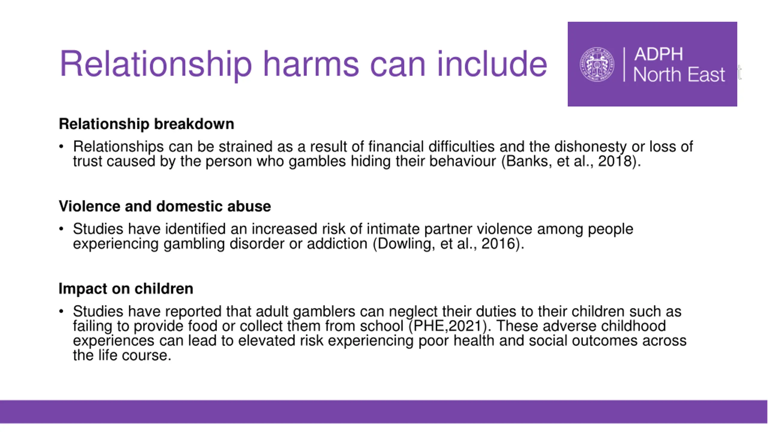 Relationship harms can include Relationship breakdown Relationships can be strained as a result of financial difficulties and the dishonesty or loss of trust caused by the person who gambles hiding their behaviour (Banks, et al., 2018). Violence and domestic abuse Studies have identified an increased risk of intimate partner violence among people experiencing gambling disorder or addiction (Dowling, et al., 2016). Impact on children Studies have reported that adult gamblers can neglect their duties to their children such as failing to provide food or collect them from school (PHE,2021). These adverse childhood experiences can lead to elevated risk experiencing poor health and social outcomes across the life course.