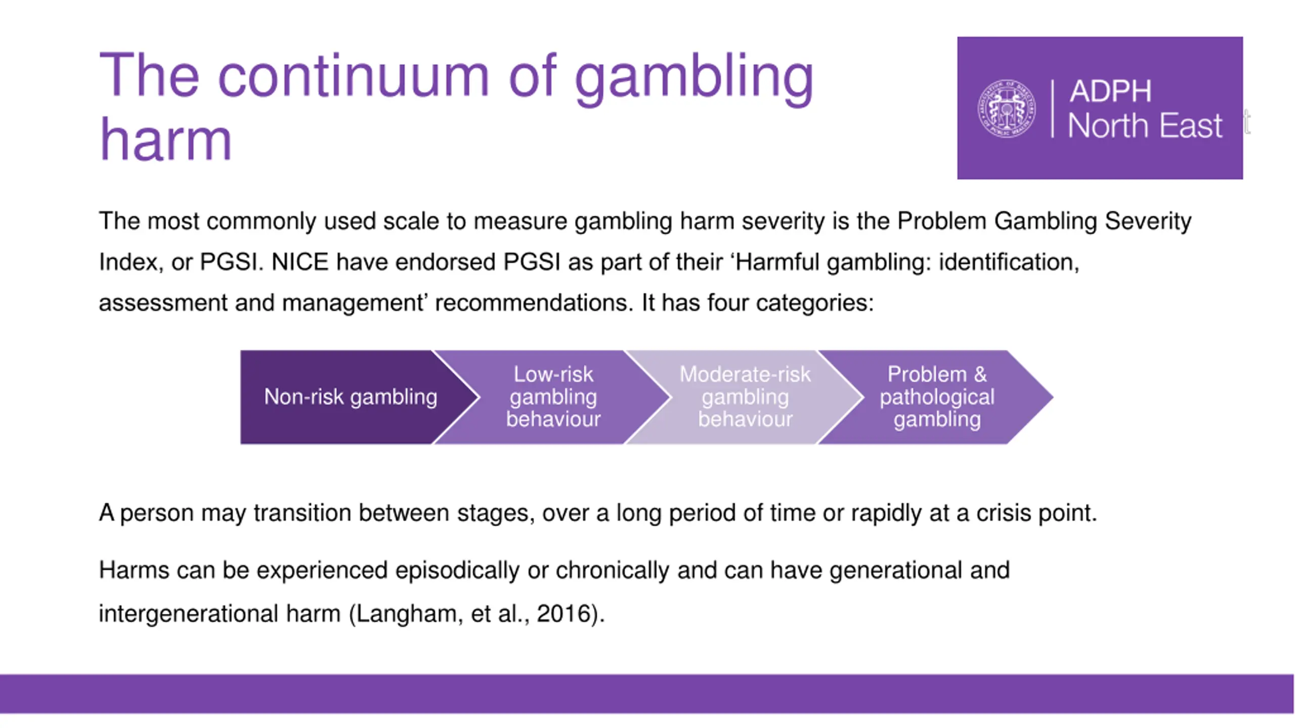 The continuum of gambling harm The most commonly used scale to measure gambling harm severity is the Problem Gambling Severity Index, or PGSI. NICE have endorsed PGSI as part of their Harmful gambling: identification, assessment and management recommendations. It has four categories: Low-risk gambling behaviour Moderate-risk gambling behaviour Problem & pathological gambling Non-risk gambling A person may transition between stages, over a long period of time or rapidly at a crisis point. Harms can be experienced episodically or chronically and can have generational and intergenerational harm (Langham, et al., 2016).
