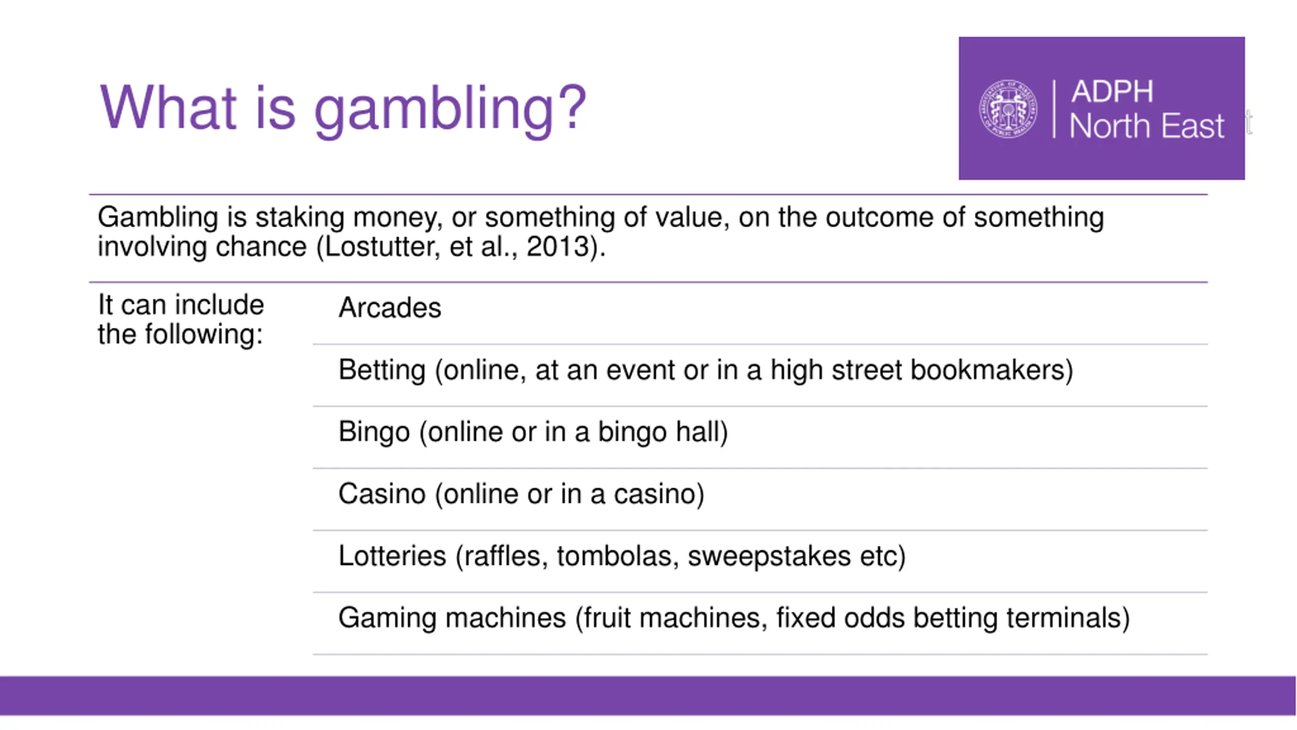 What is gambling? Gambling is staking money, or something of value, on the outcome of something involving chance (Lostutter, et al., 2013). It can include the following: Arcades Betting (online, at an event or in a high street bookmakers) Bingo (online or in a bingo hall) Casino (online or in a casino) Lotteries (raffles, tombolas, sweepstakes etc) Gaming machines (fruit machines, fixed odds betting terminals)