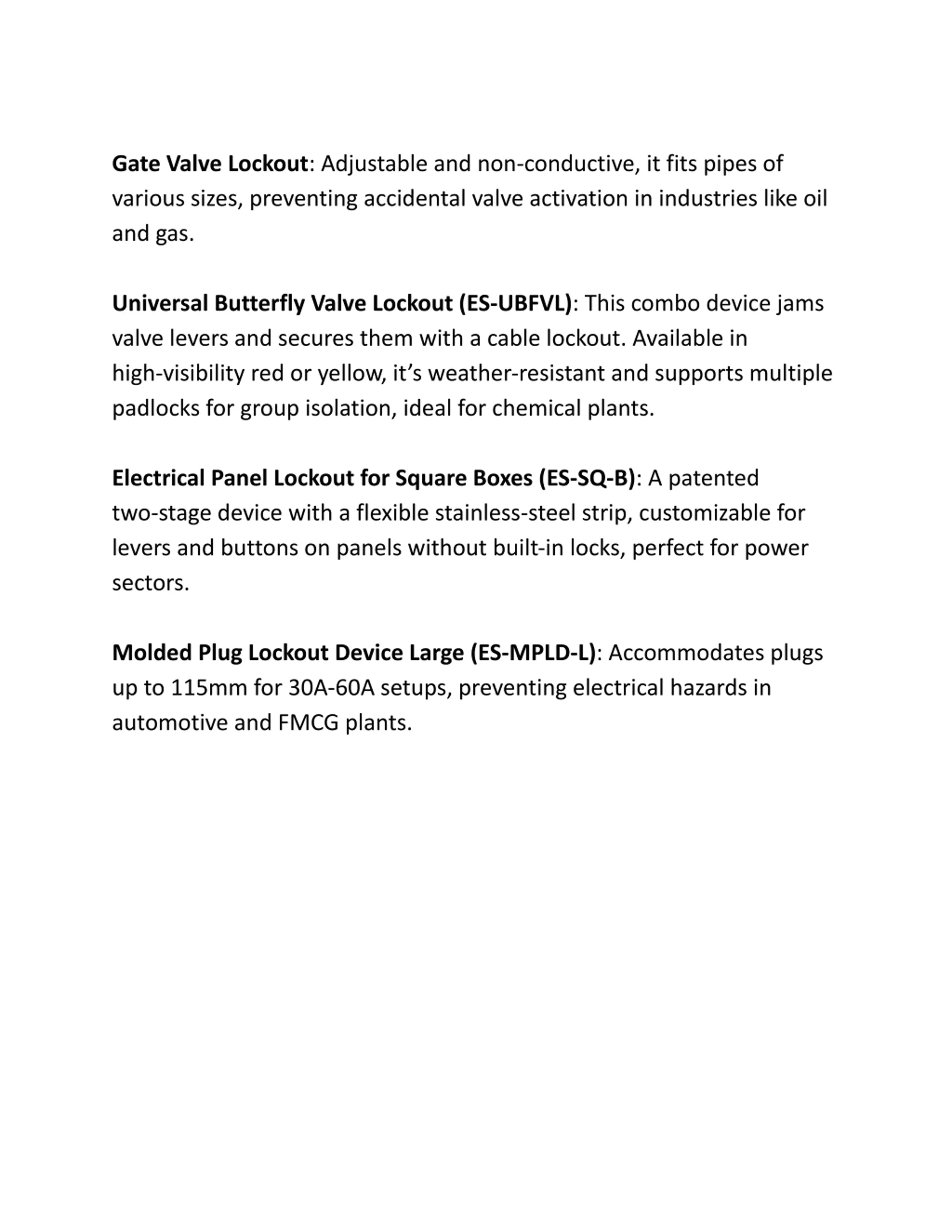 E-Square Alliance: Pioneering Safety Solutions Since 2002, E-Square Alliance, based in New Delhi, India, has been a global giant in LOTOTO solutions (Lockout/Tagout/Tryout/Testing/Operational). With a focus on Product, Process, and People, E-Square delivers a comprehensive range of LOTO devices tailored to industries like pharmaceuticals, steel, automotive, energy, FMCG and all the others manufacturing plants. Their products combine innovation with practicality, ensuring zero-harm environments. Innovative LOTO Devices from E-Square: E-Square s portfolio is packed with game-changing devices that redefine safety and efficiency: