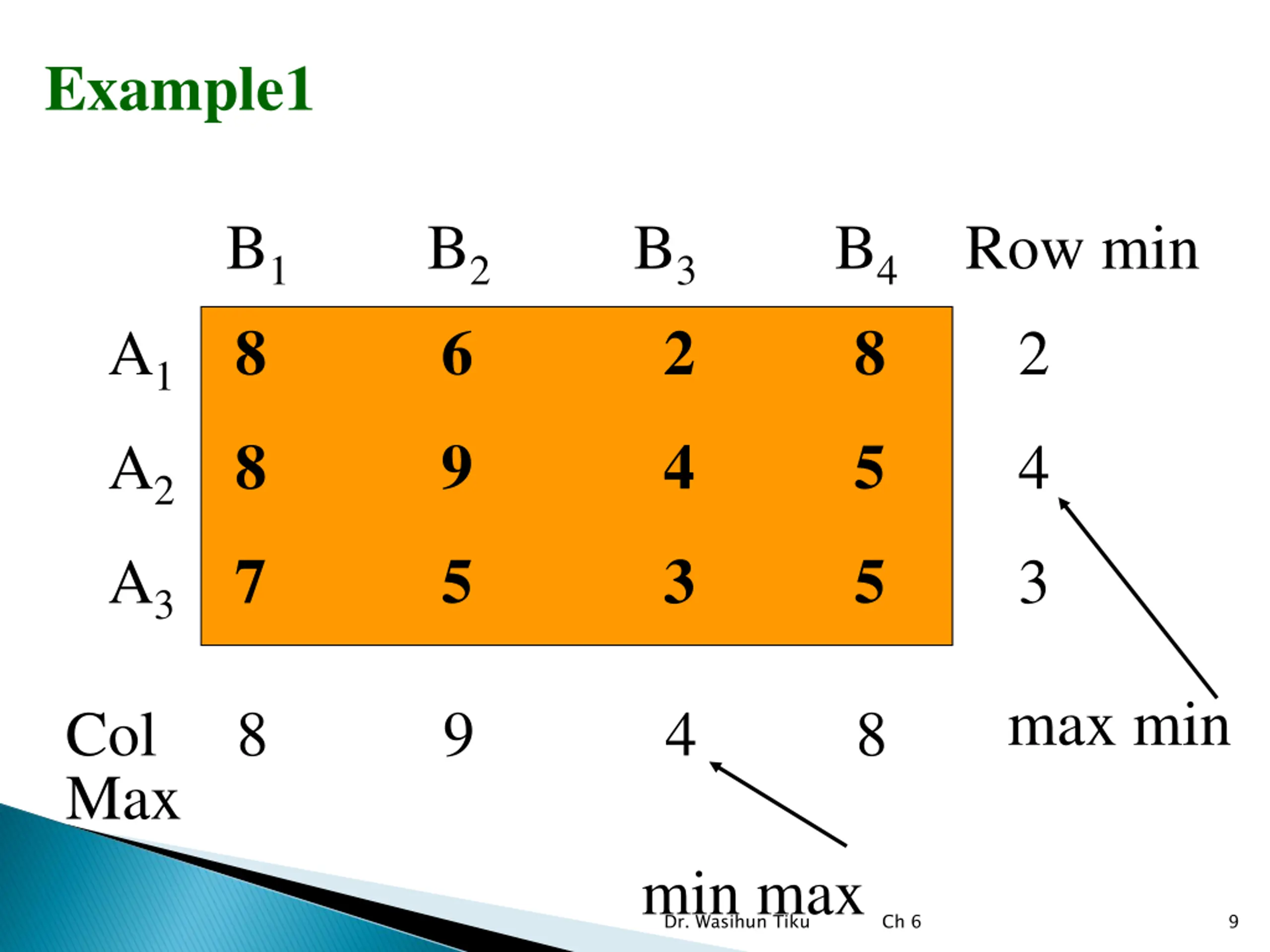 Example1 B1 B2 B3 B4 Row min 8 6 2 8 A1 A2 A3 2 8 9 4 5 4 7 5 3 5 3 max min Col 8 9 4 8 Max min max Dr. Wasihun Tiku Ch 6 9