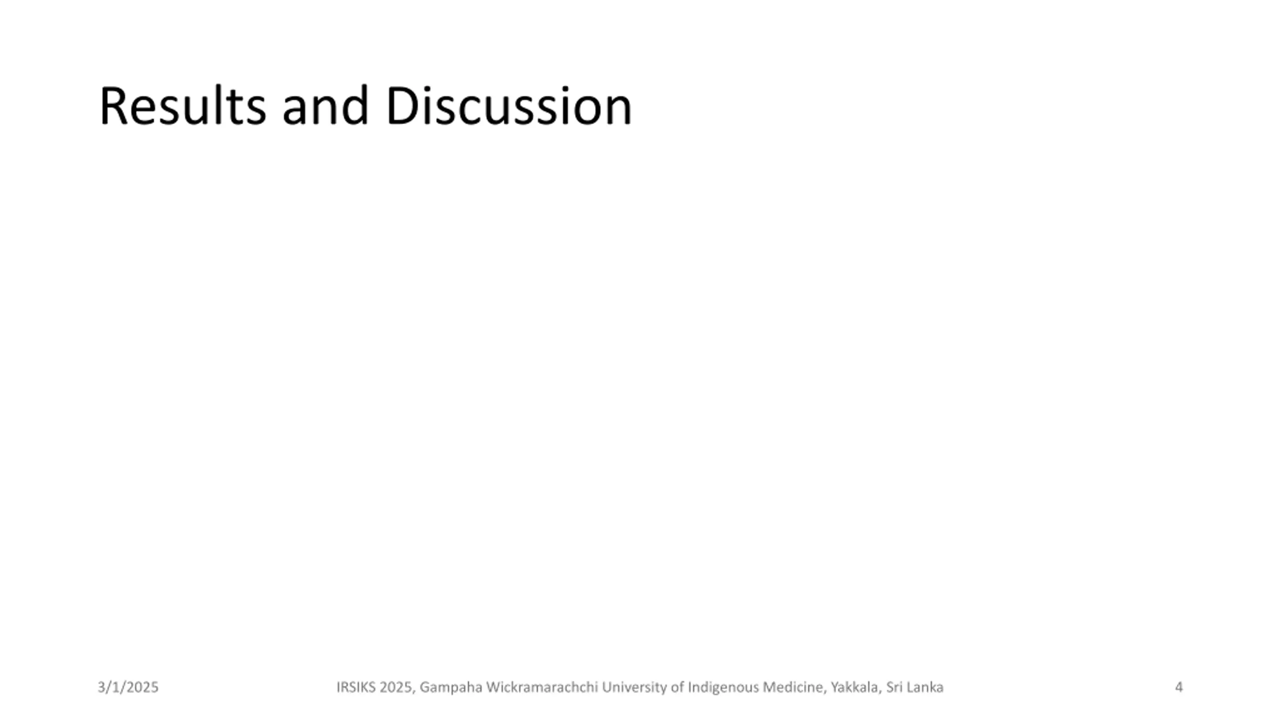 Results and Discussion 3/1/2025 IRSIKS 2025, Gampaha Wickramarachchi University of Indigenous Medicine, Yakkala, Sri Lanka 4