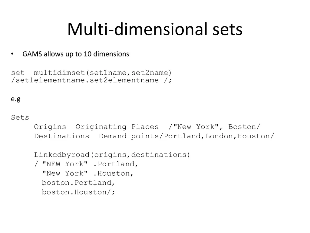 Multi-dimensional sets GAMS allows up to 10 dimensions set multidimset(set1name,set2name) /set1elementname.set2elementname /; e.g Sets Origins Destinations Demand points/Portland,London,Houston/ Originating Places /"New York", Boston/ Linkedbyroad(origins,destinations) / "NEW York" .Portland, "New York" .Houston, boston.Portland, boston.Houston/;