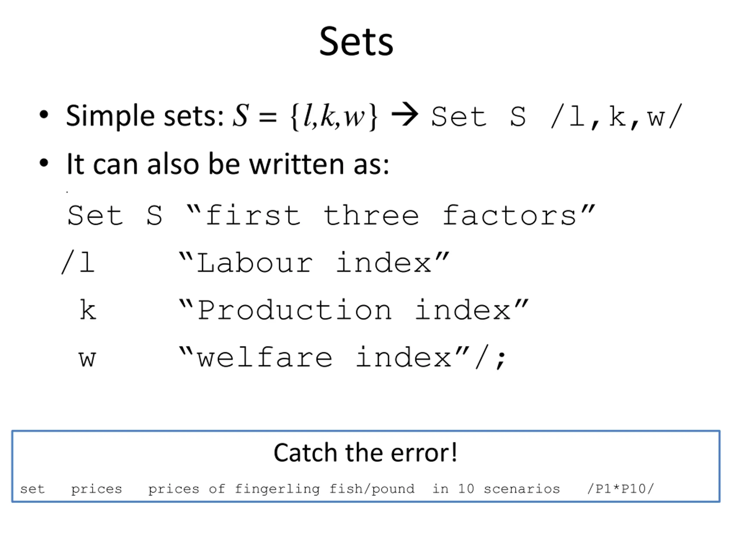 Sets Simple sets: S = {l,k,w} Set S /l,k,w/ It can also be written as: . Set S first three factors /l Labour index k Production index w welfare index /; Catch the error! set prices prices of fingerling fish/pound in 10 scenarios /P1*P10/