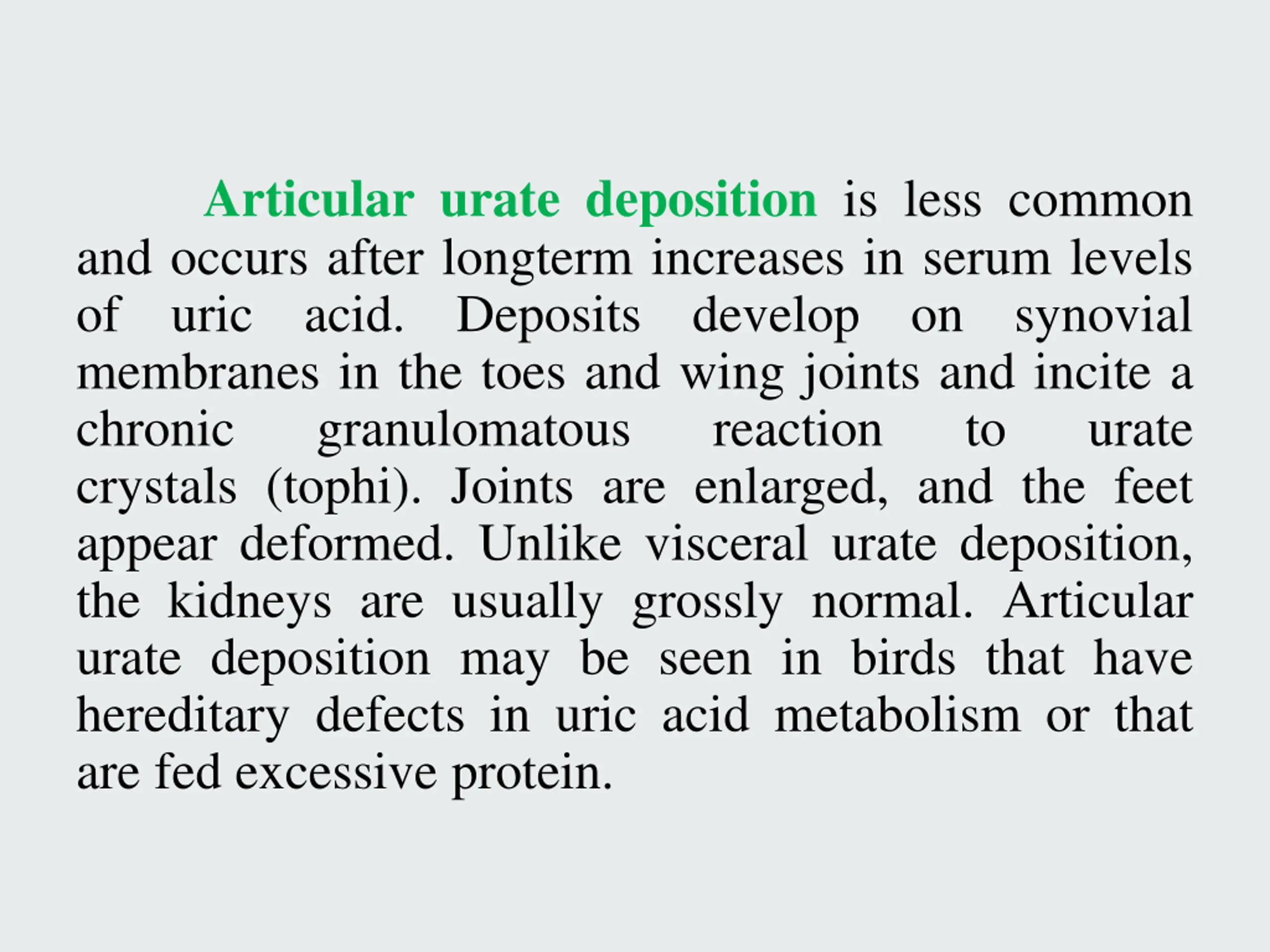 Articular urate deposition is less common and occurs after longterm increases in serum levels of uric acid. Deposits membranes in the toes and wing joints and incite a chronic granulomatous crystals (tophi). Joints are enlarged, and the feet appear deformed. Unlike visceral urate deposition, the kidneys are usually grossly normal. Articular urate deposition may be seen in birds that have hereditary defects in uric acid metabolism or that are fed excessive protein. develop on synovial reaction to urate