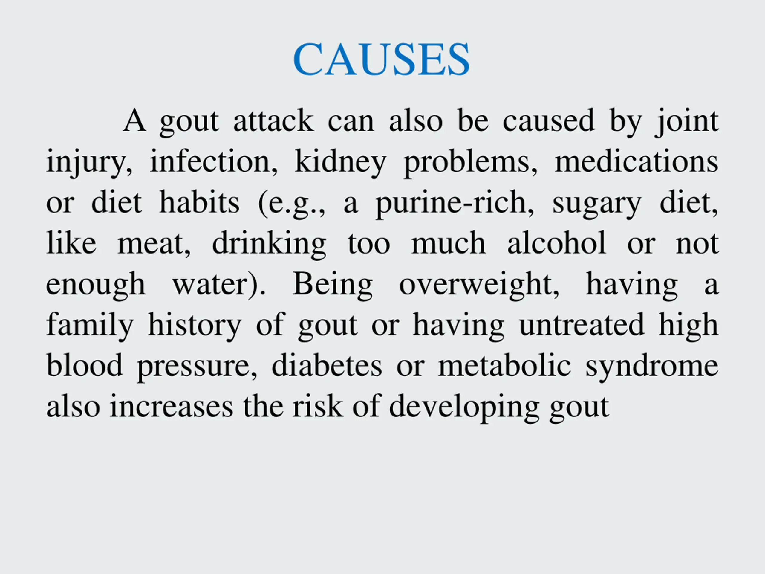 CAUSES A gout attack can also be caused by joint injury, infection, kidney problems, medications or diet habits (e.g., a purine-rich, sugary diet, like meat, drinking too much alcohol or not enough water). Being overweight, having a family history of gout or having untreated high blood pressure, diabetes or metabolic syndrome also increases the risk of developing gout