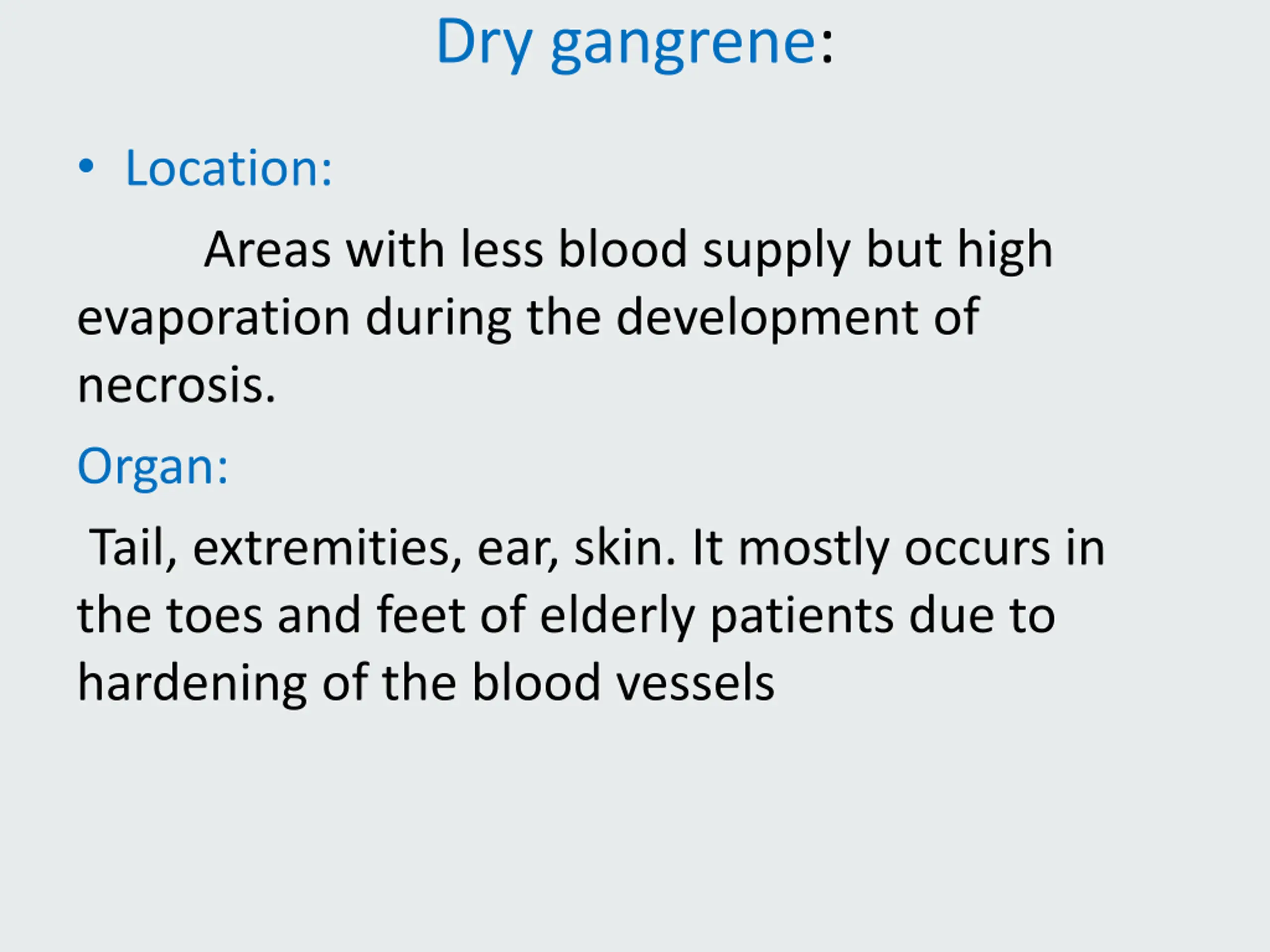 Dry gangrene: Location: Areas with less blood supply but high evaporation during the development of necrosis. Organ: Tail, extremities, ear, skin. It mostly occurs in the toes and feet of elderly patients due to hardening of the blood vessels