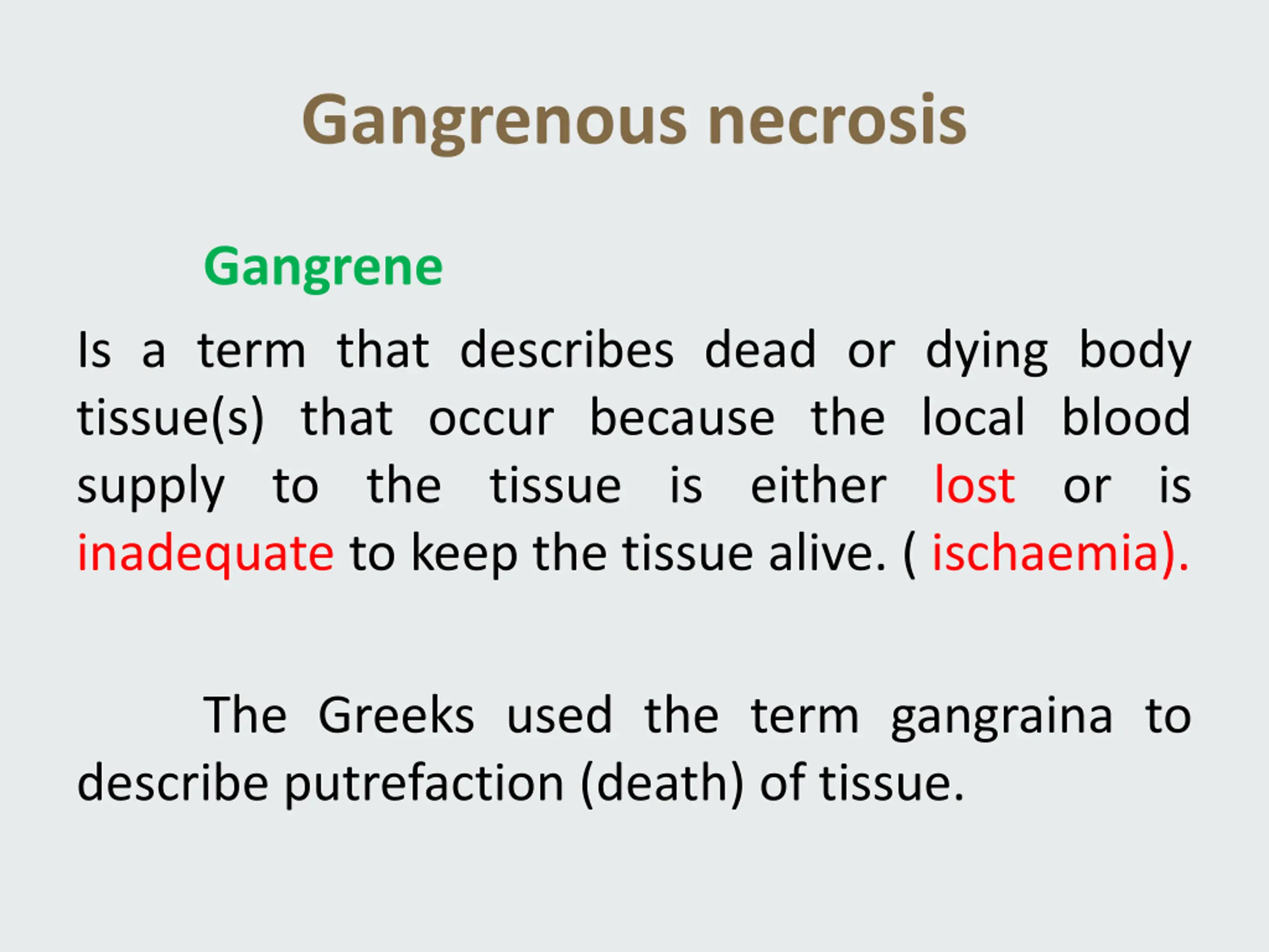 Gangrenous necrosis Gangrene Is a term that describes dead or dying body tissue(s) that occur because the local blood supply to the tissue is either lost or is inadequate to keep the tissue alive. ( ischaemia). The Greeks used the term gangraina to describe putrefaction (death) of tissue.