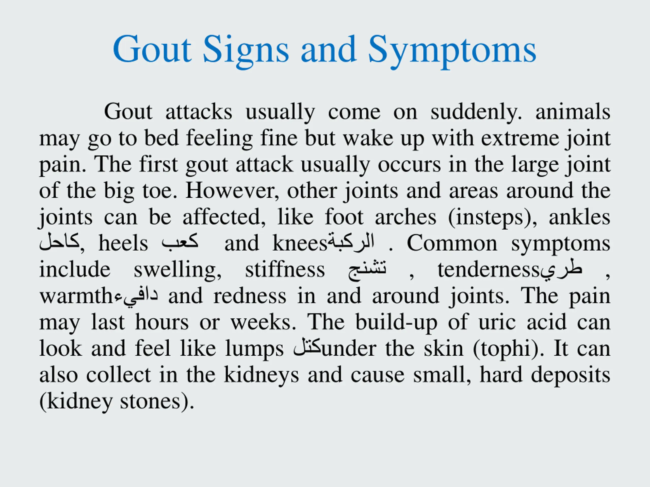 Gout Signs and Symptoms Gout attacks usually come on suddenly. animals may go to bed feeling fine but wake up with extreme joint pain. The first gout attack usually occurs in the large joint of the big toe. However, other joints and areas around the joints can be affected, like foot arches (insteps), ankles , heels and knees . Common symptoms include swelling, stiffness warmth and redness in and around joints. The pain may last hours or weeks. The build-up of uric acid can look and feel like lumps under the skin (tophi). It can also collect in the kidneys and cause small, hard deposits (kidney stones). , tenderness ,