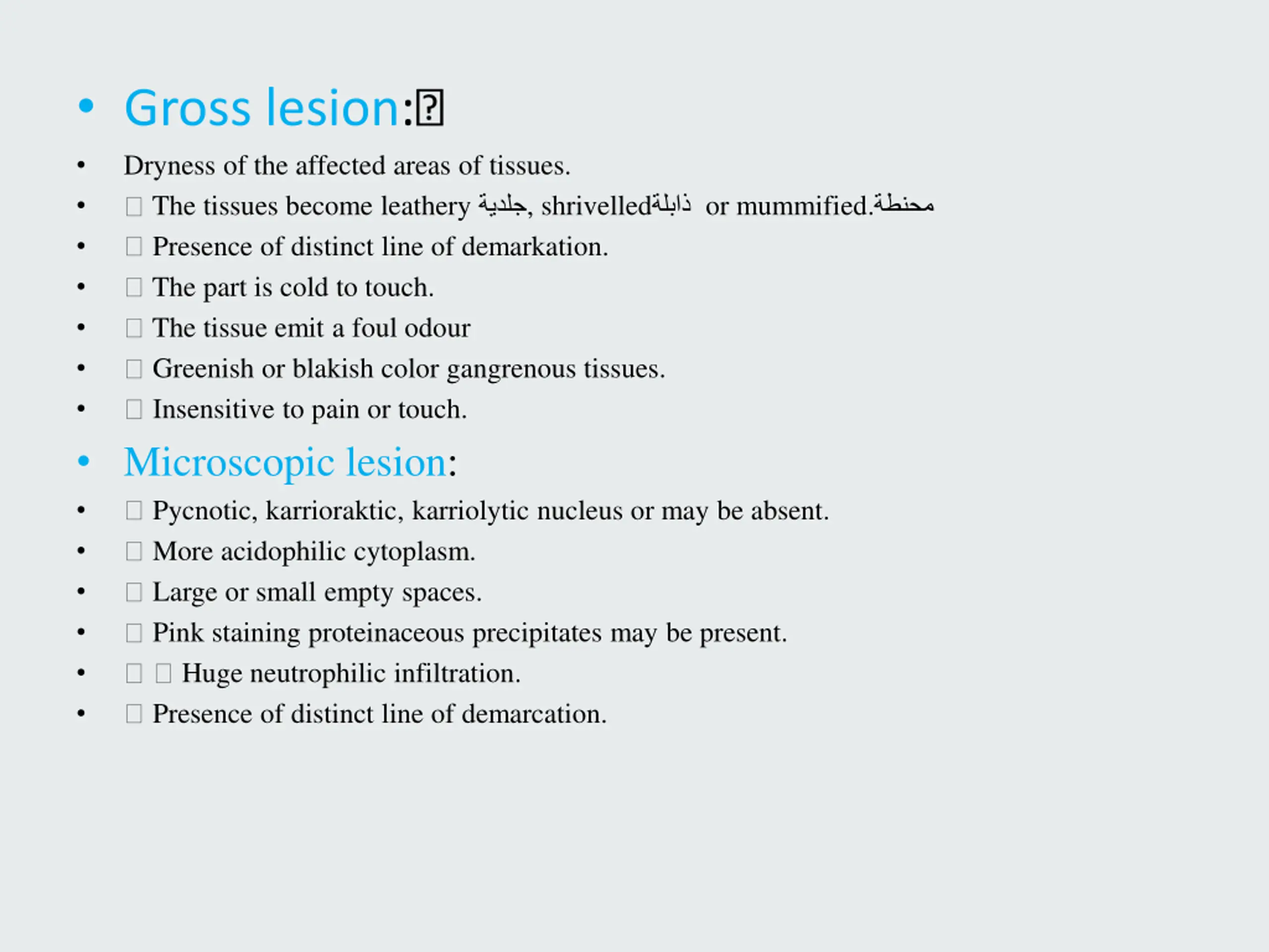 Gross lesion: Dryness of the affected areas of tissues. The tissues become leathery , shrivelled or mummified. Presence of distinct line of demarkation. The part is cold to touch. The tissue emit a foul odour Greenish or blakish color gangrenous tissues. Insensitive to pain or touch. Microscopic lesion: Pycnotic, karrioraktic, karriolytic nucleus or may be absent. More acidophilic cytoplasm. Large or small empty spaces. Pink staining proteinaceous precipitates may be present. Huge neutrophilic infiltration. Presence of distinct line of demarcation.