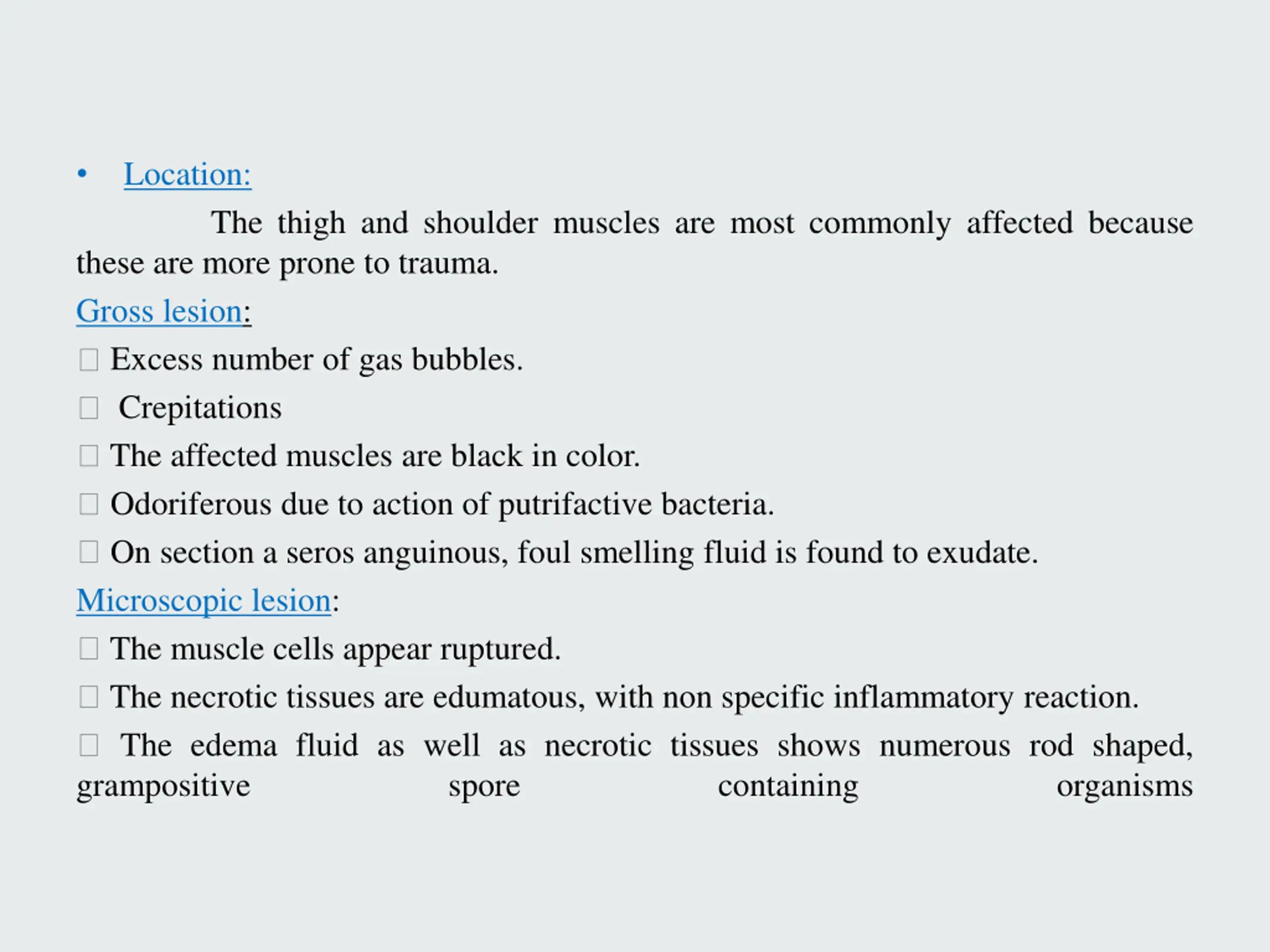Location: The thigh and shoulder muscles are most commonly affected because these are more prone to trauma. Gross lesion: Excess number of gas bubbles. Crepitations The affected muscles are black in color. Odoriferous due to action of putrifactive bacteria. On section a seros anguinous, foul smelling fluid is found to exudate. Microscopic lesion: The muscle cells appear ruptured. The necrotic tissues are edumatous, with non specific inflammatory reaction. The edema fluid as well as necrotic tissues shows numerous rod shaped, grampositive spore containing organisms