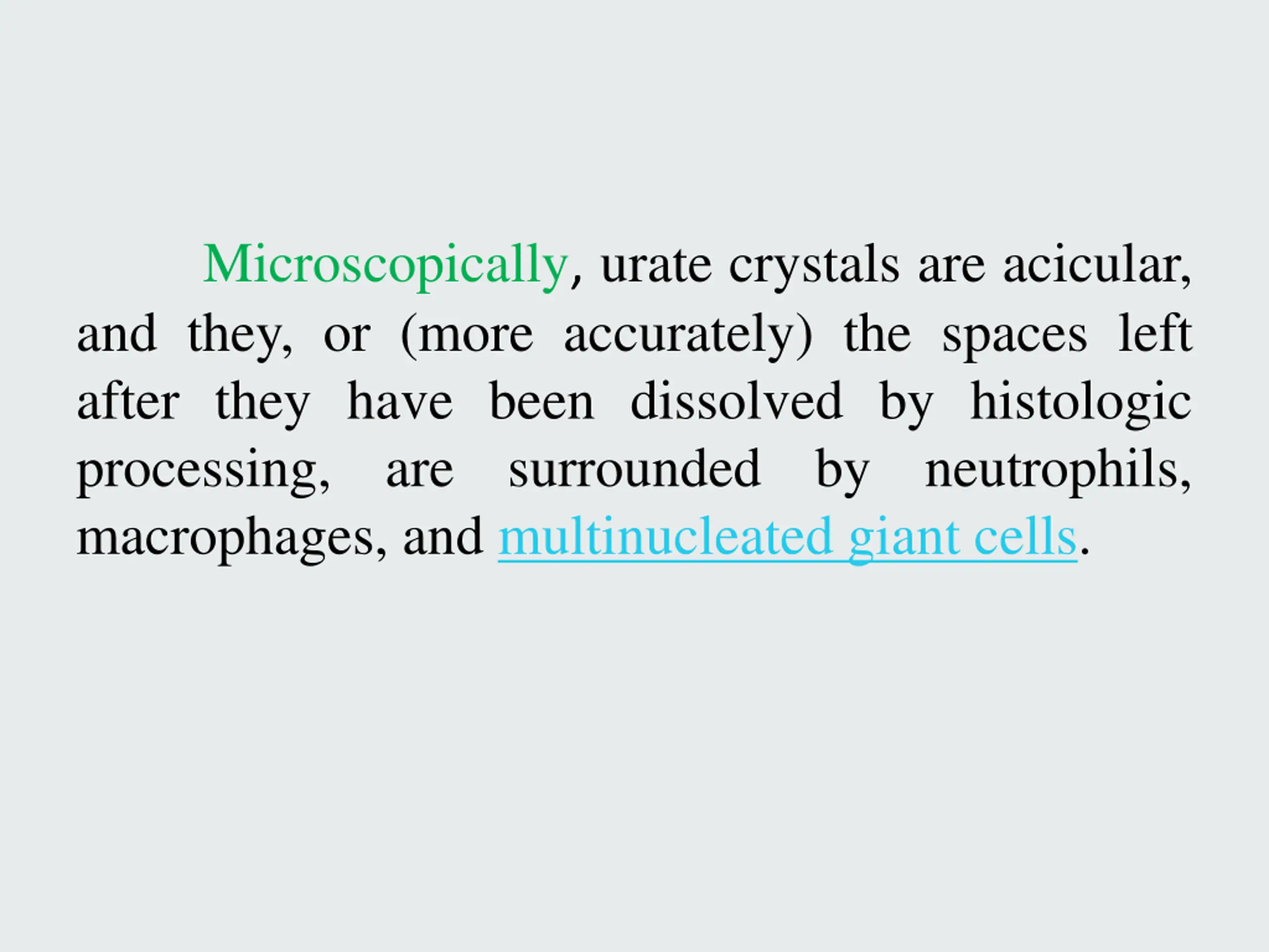 Microscopically, urate crystals are acicular, and they, or (more accurately) the spaces left after they have been dissolved by histologic processing, are surrounded macrophages, and multinucleated giant cells. by neutrophils,