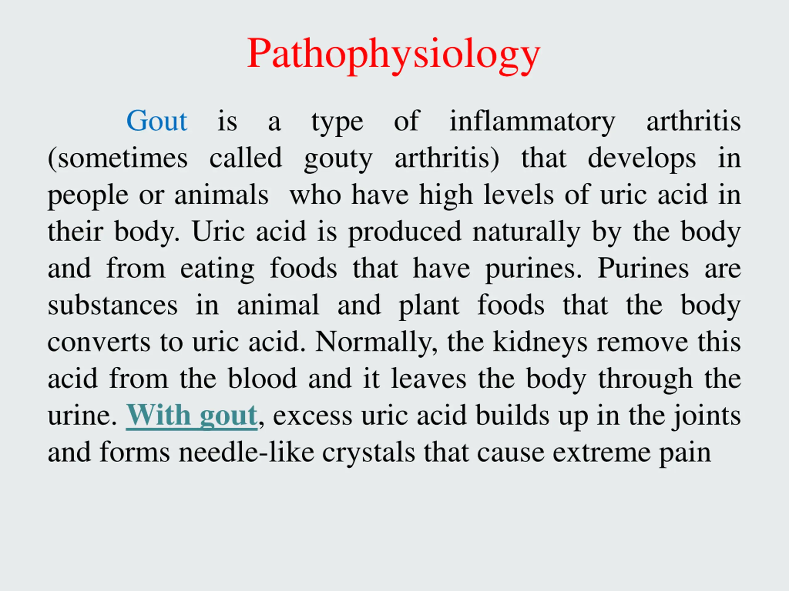 Pathophysiology Gout is a type of inflammatory arthritis (sometimes called gouty arthritis) that develops in people or animals who have high levels of uric acid in their body. Uric acid is produced naturally by the body and from eating foods that have purines. Purines are substances in animal and plant foods that the body converts to uric acid. Normally, the kidneys remove this acid from the blood and it leaves the body through the urine. With gout, excess uric acid builds up in the joints and forms needle-like crystals that cause extreme pain