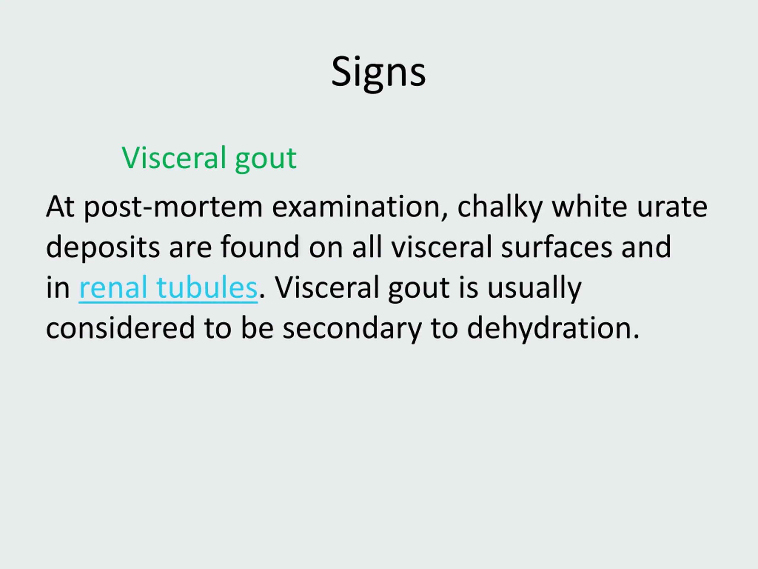 Signs Visceral gout At post-mortem examination, chalky white urate deposits are found on all visceral surfaces and in renal tubules. Visceral gout is usually considered to be secondary to dehydration.