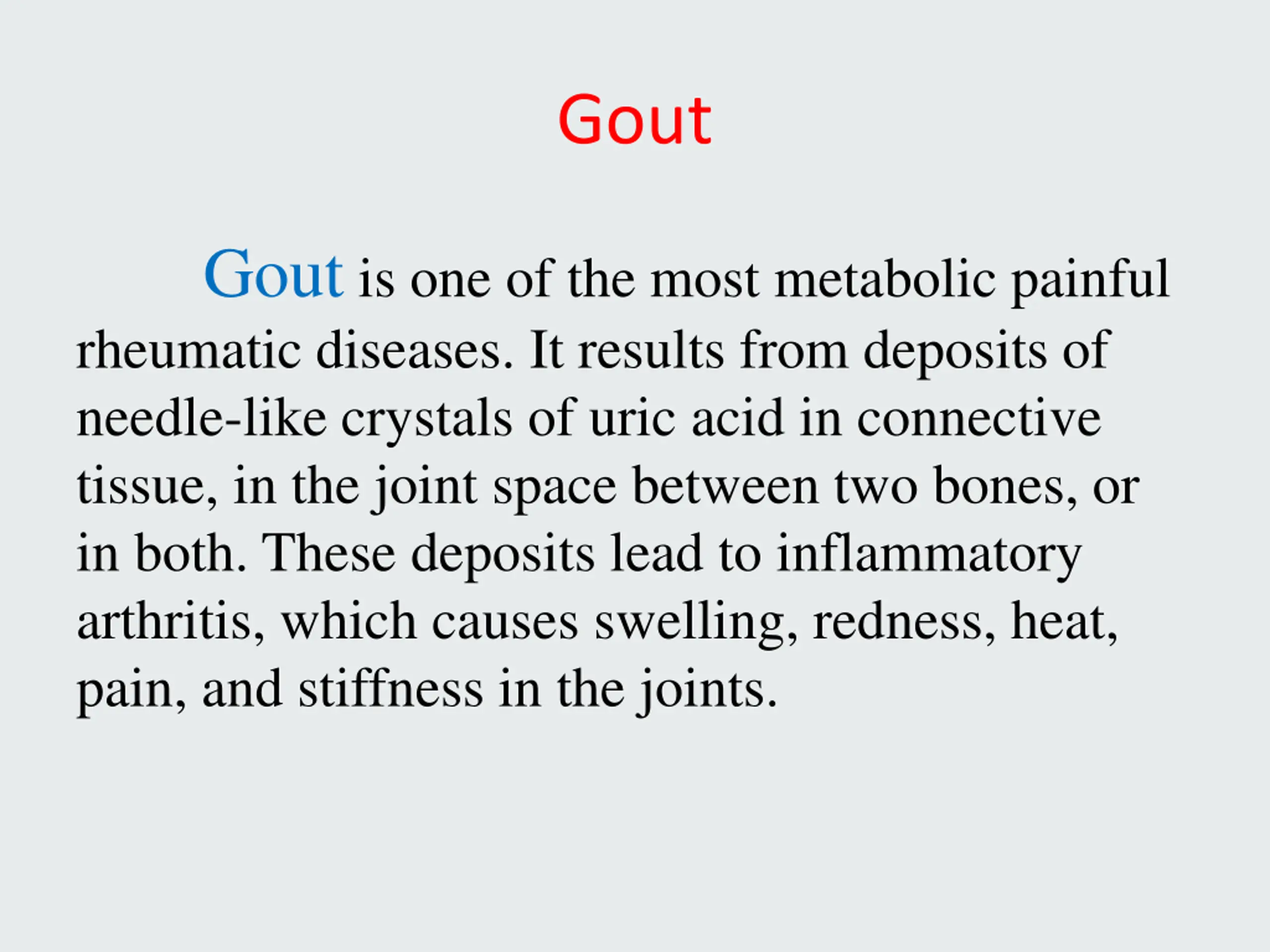 Gout Gout is one of the most metabolic painful rheumatic diseases. It results from deposits of needle-like crystals of uric acid in connective tissue, in the joint space between two bones, or in both. These deposits lead to inflammatory arthritis, which causes swelling, redness, heat, pain, and stiffness in the joints.
