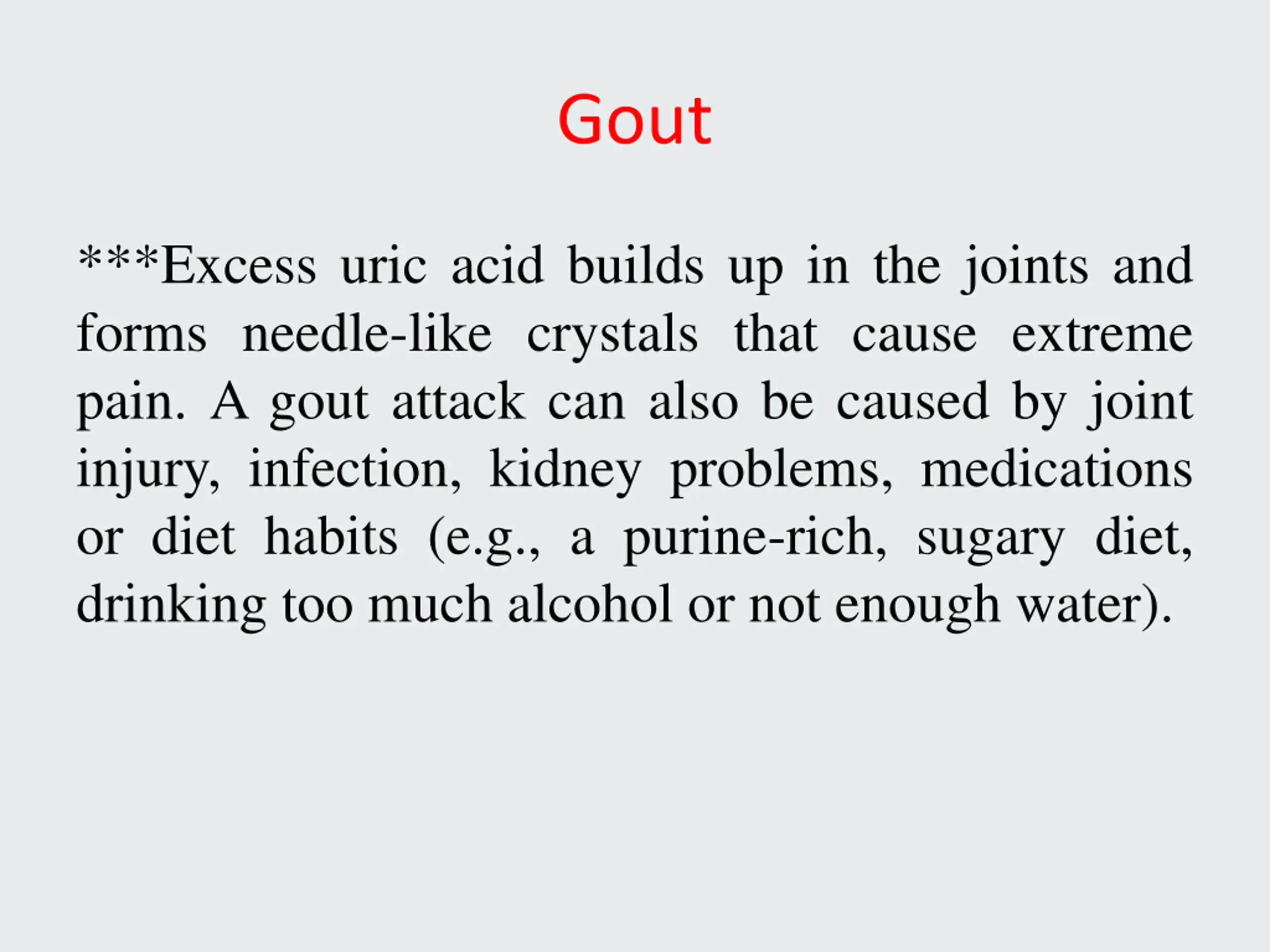 Gout ***Excess uric acid builds up in the joints and forms needle-like crystals that cause extreme pain. A gout attack can also be caused by joint injury, infection, kidney problems, medications or diet habits (e.g., a purine-rich, sugary diet, drinking too much alcohol or not enough water).