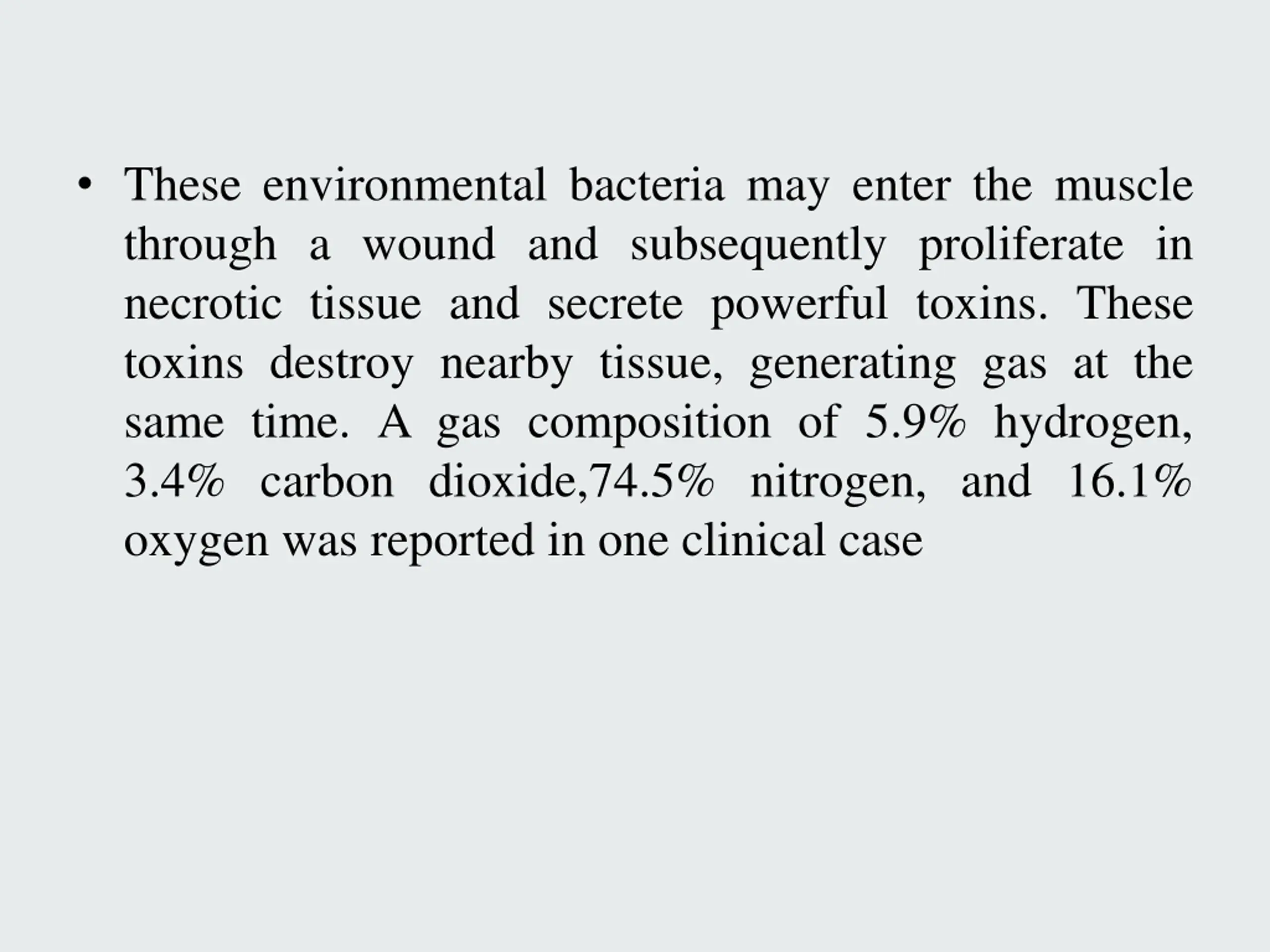 These environmental bacteria may enter the muscle through a wound and subsequently proliferate in necrotic tissue and secrete powerful toxins. These toxins destroy nearby tissue, generating gas at the same time. A gas composition of 5.9% hydrogen, 3.4% carbon dioxide,74.5% nitrogen, and 16.1% oxygen was reported in one clinical case