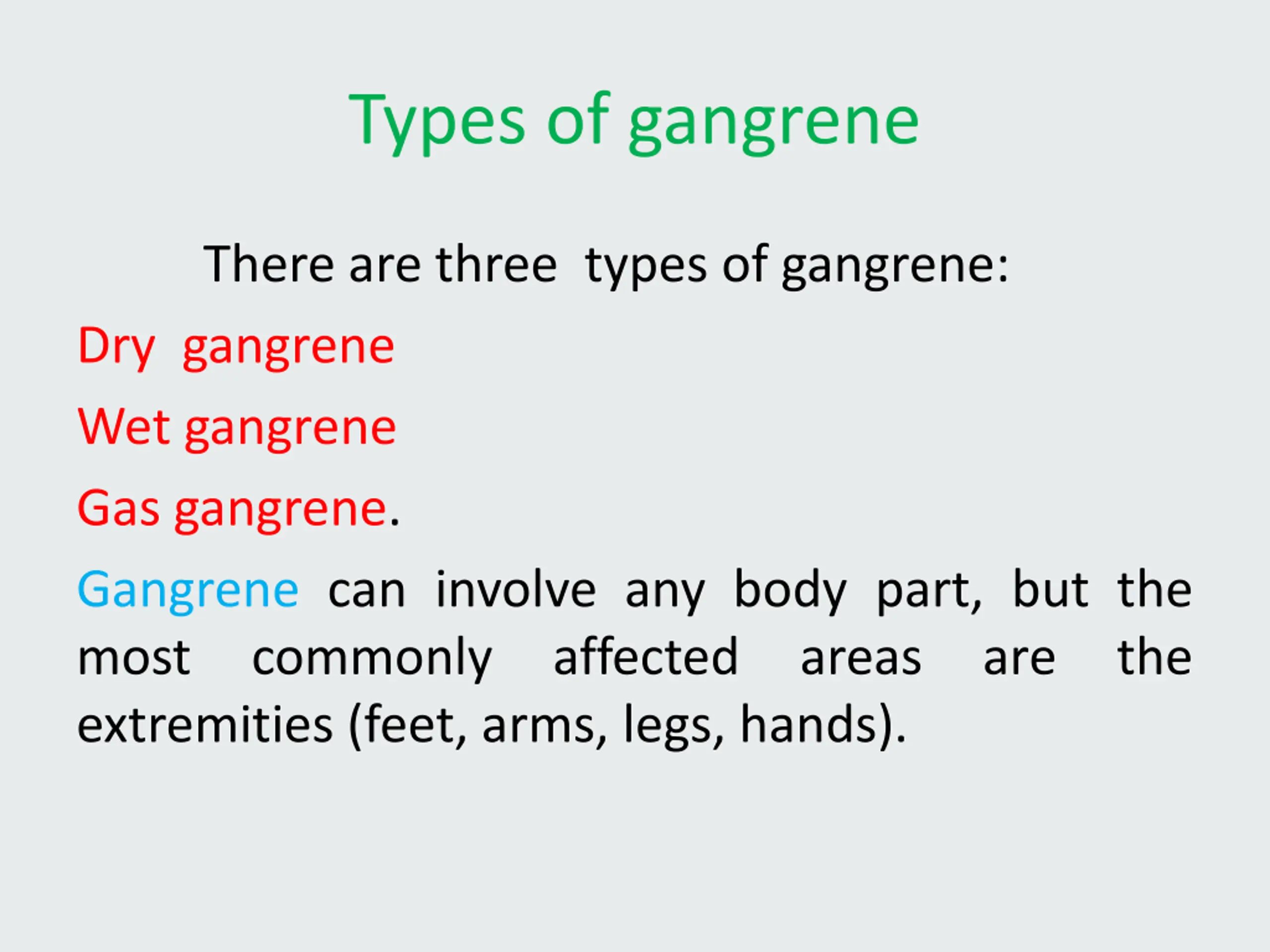 Types of gangrene There are three types of gangrene: Dry gangrene Wet gangrene Gas gangrene. Gangrene can involve any body part, but the most commonly affected extremities (feet, arms, legs, hands). areas are the