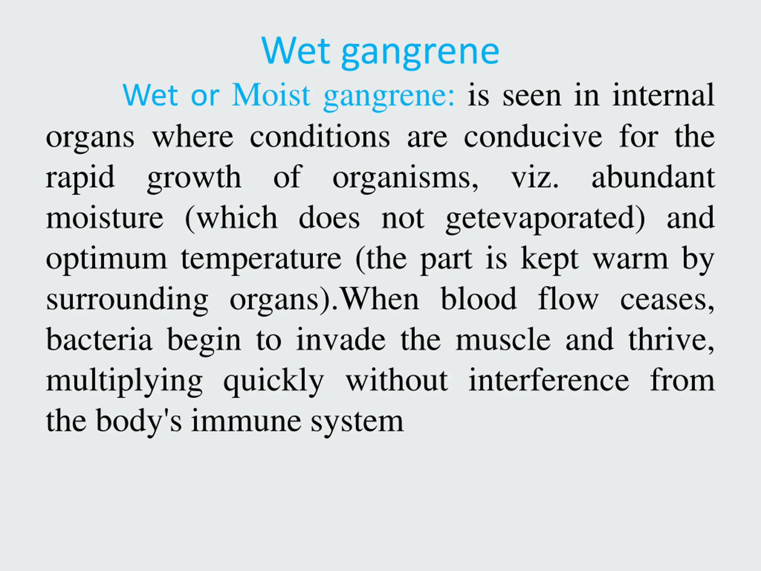 Wet gangrene Wet or Moist gangrene: is seen in internal organs where conditions are conducive for the rapid growth of organisms, moisture (which does not getevaporated) and optimum temperature (the part is kept warm by surrounding organs).When blood flow ceases, bacteria begin to invade the muscle and thrive, multiplying quickly without interference from the body's immune system viz. abundant