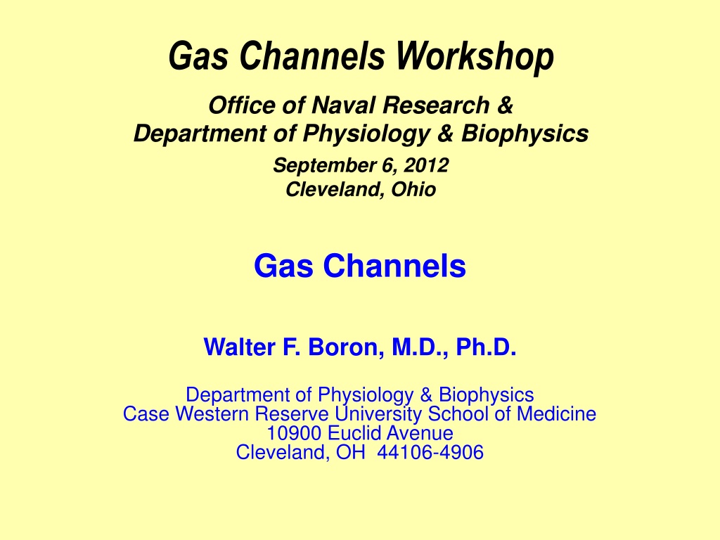 Gas Channels Workshop Office of Naval Research & Department of Physiology & Biophysics September 6, 2012 Cleveland, Ohio Gas Channels Walter F. Boron, M.D., Ph.D. Department of Physiology & Biophysics Case Western Reserve University School of Medicine 10900 Euclid Avenue Cleveland, OH 44106-4906