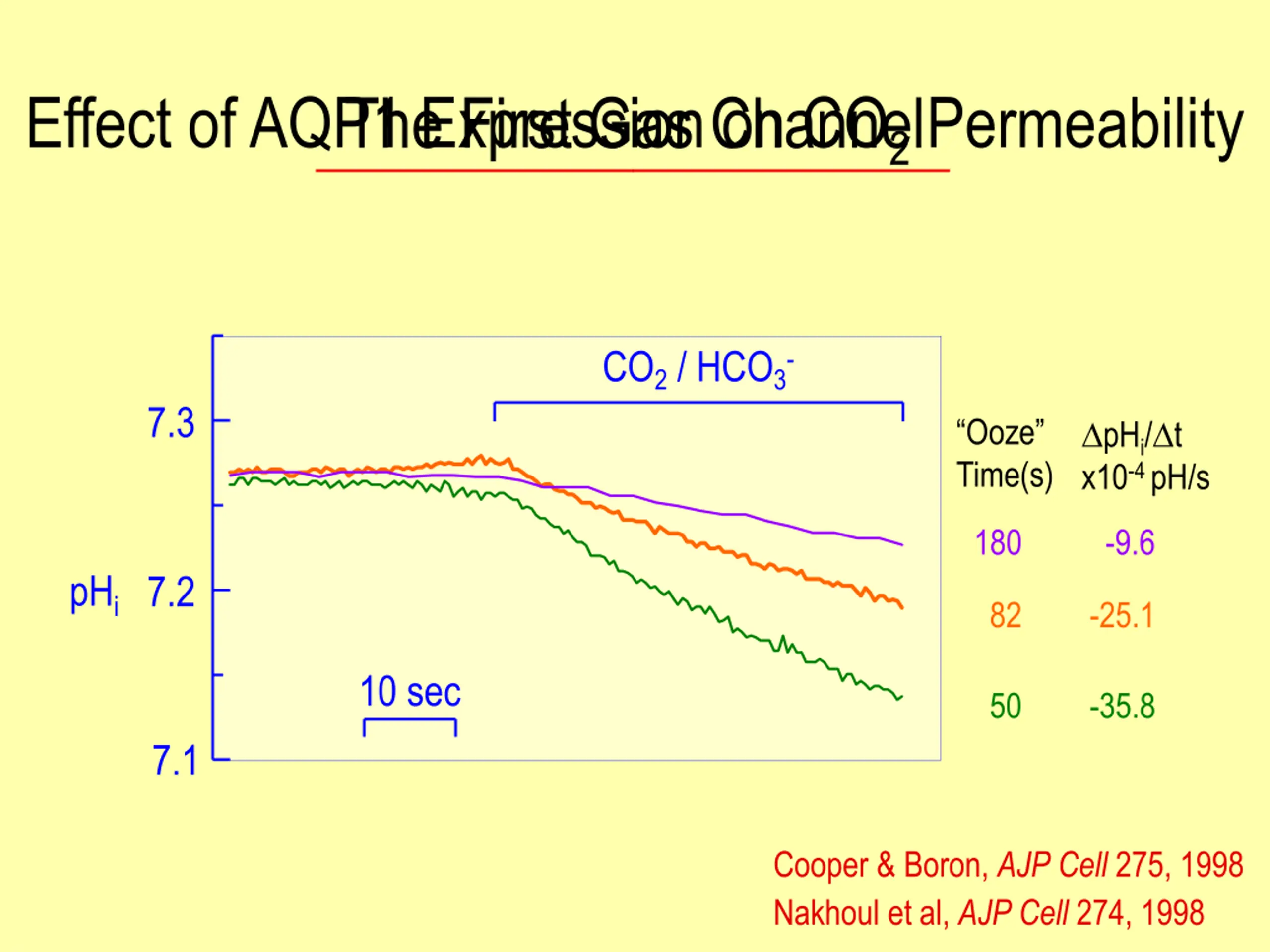 Effect of AQP1 Expression on CO2 Permeability The First Gas Channel CO2 / HCO3- 7.3 pHi/ t x10-4 pH/s Ooze Time(s) 180 -9.6 pHi 7.2 82 -25.1 10 sec 50 -35.8 7.1 Cooper & Boron, AJP Cell 275, 1998 Nakhoul et al, AJP Cell 274, 1998